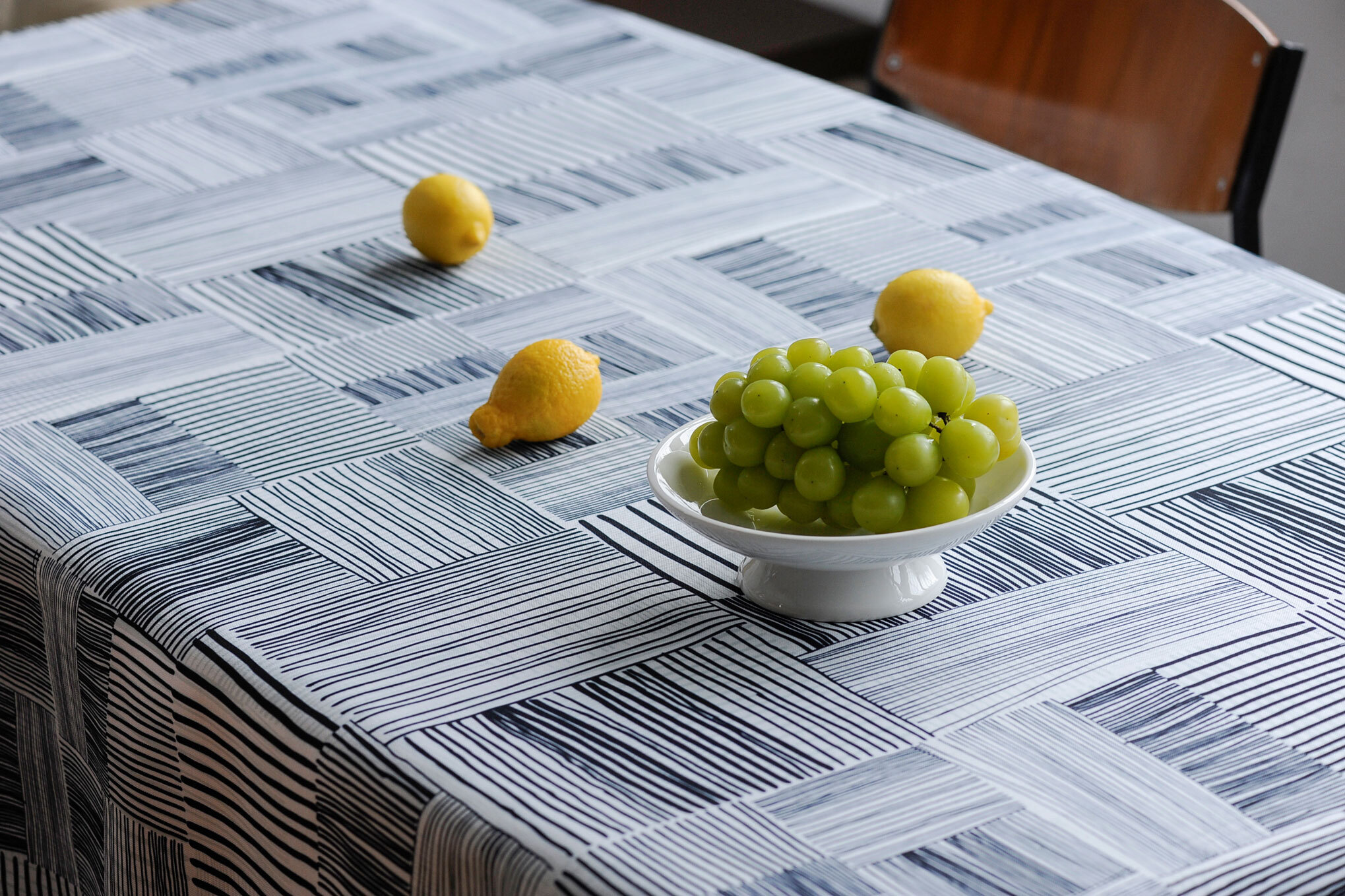 In the photo, the tablecloth hangs about 20 cm over the edge. If you’d like to achieve a similar look, add 40 cm to both the length and width of your tabletop. For example, if your table measures 140 cm x 70 cm, we recommend purchasing a tablecloth size of 180 cm x 110 cm (equivalent to 2 yards).