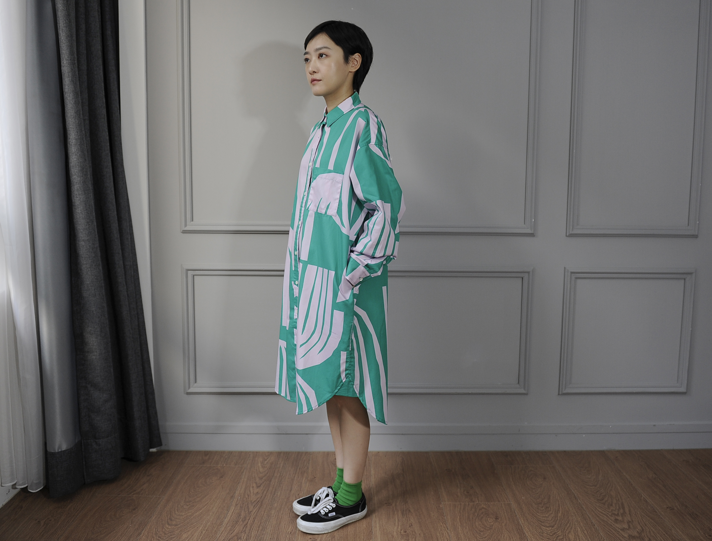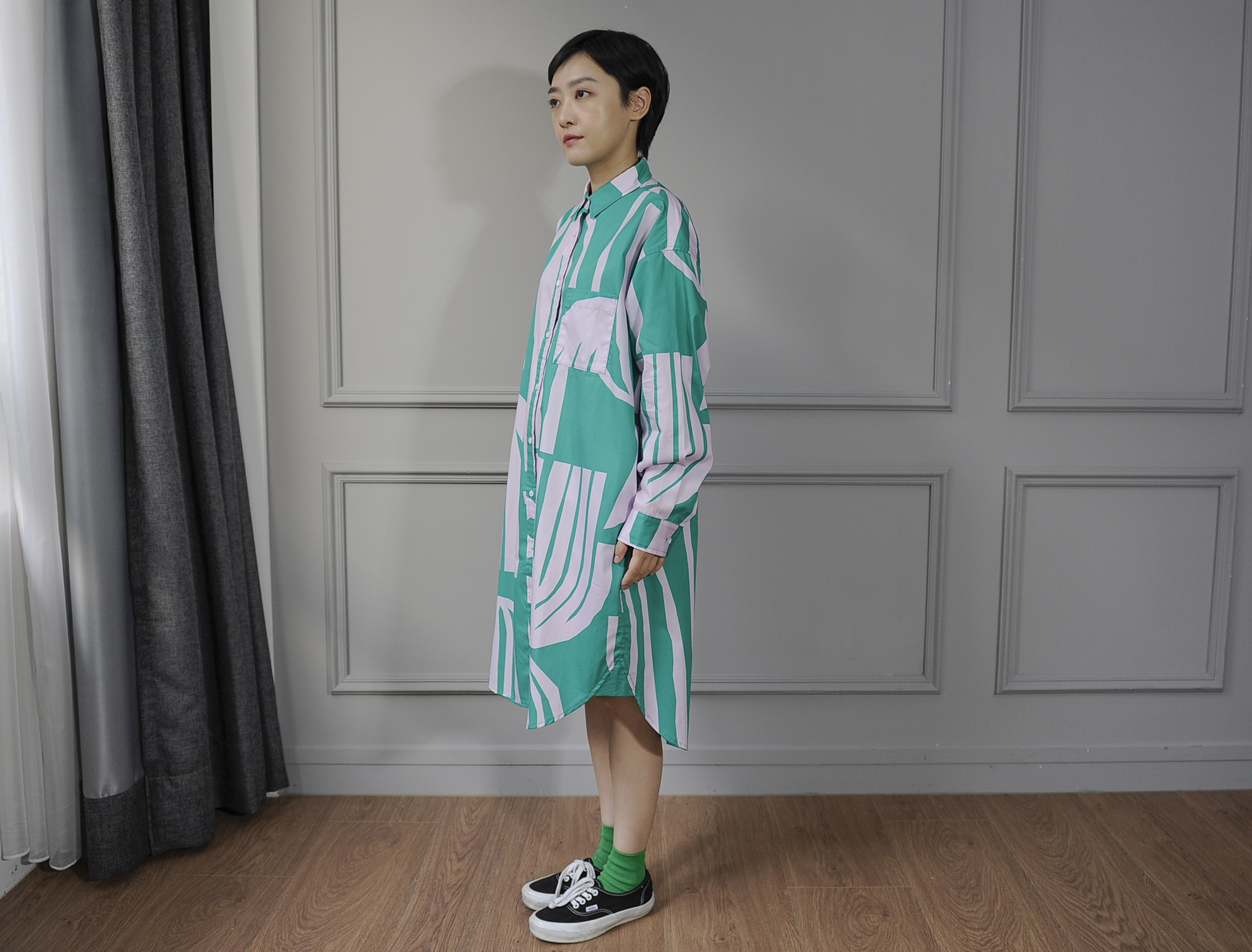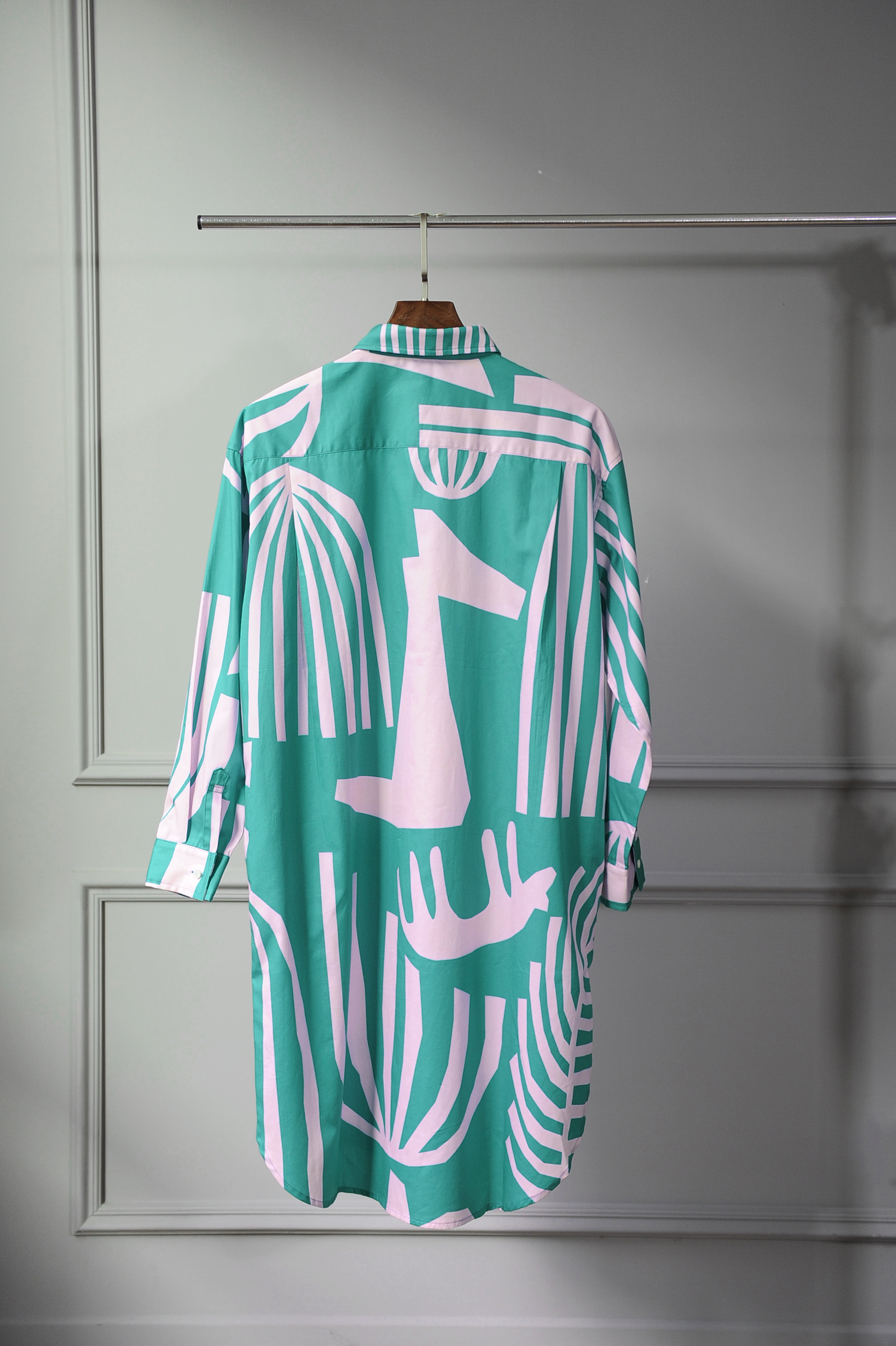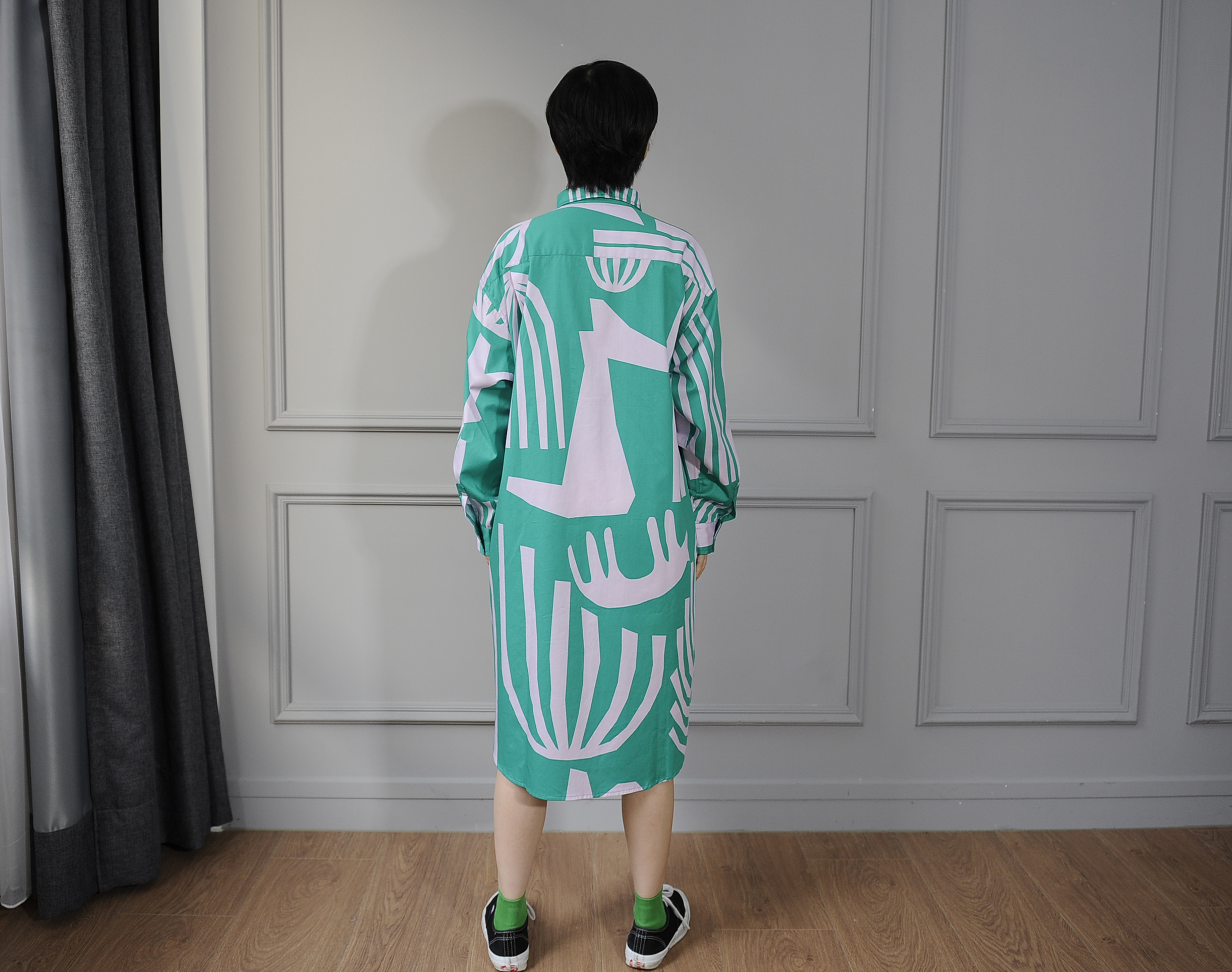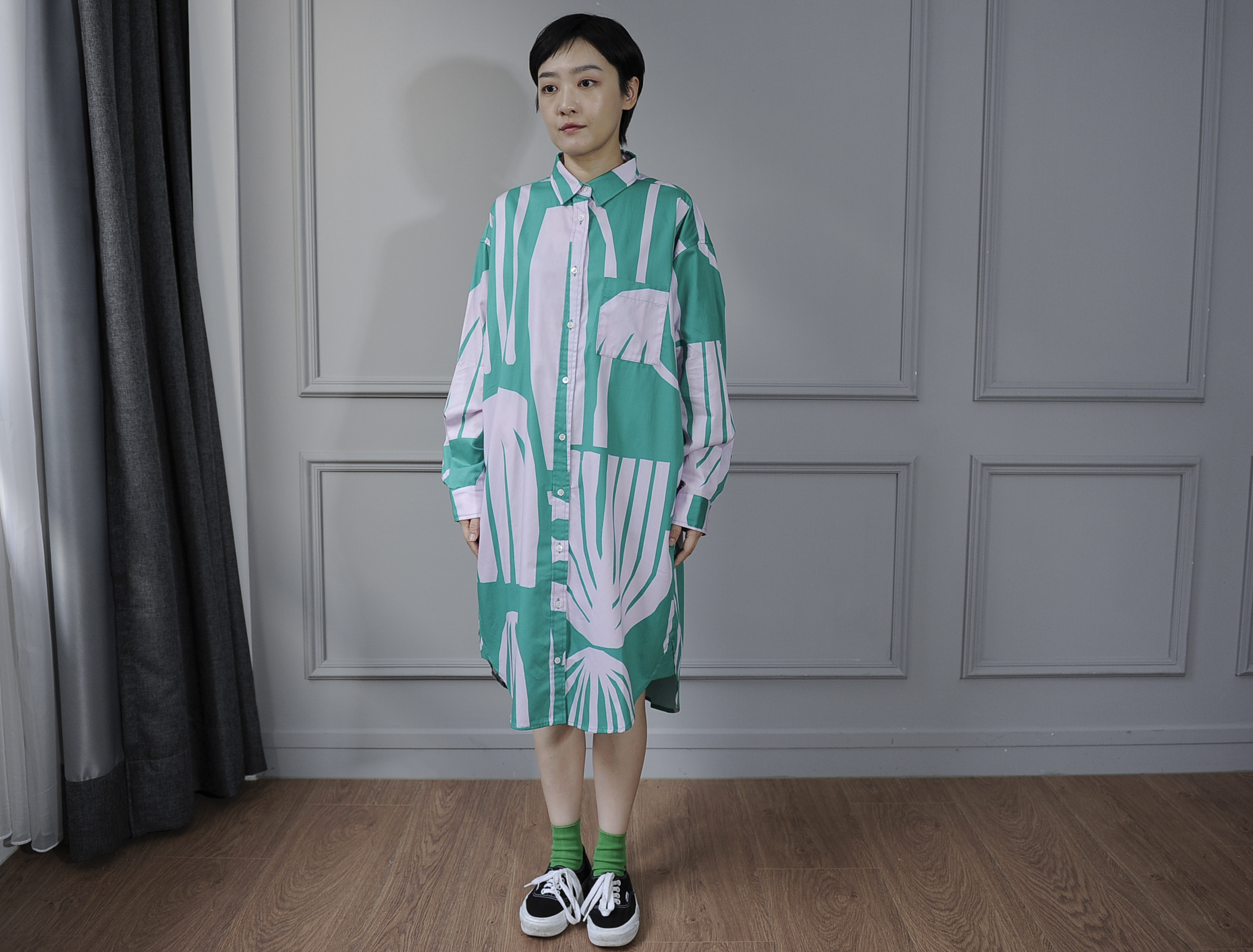 There's no better way to show off our signature patterns than by wearing them. This elongated shirt dress offers a subtle yet lively sheen for a sophisticated look. Features like the curved hem and side pockets add versatility, making it suitable as a top, a dress, or even an outer layer.