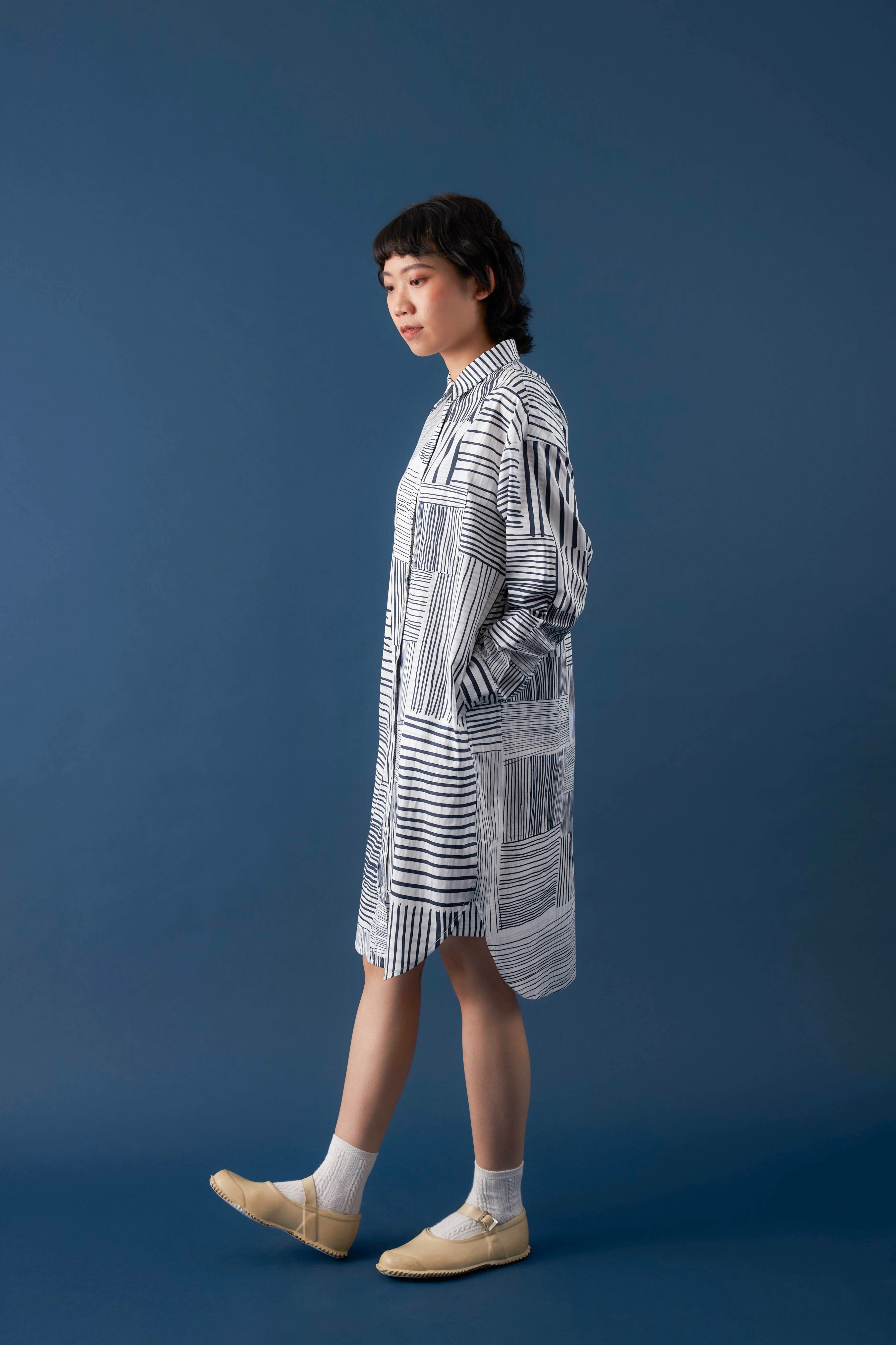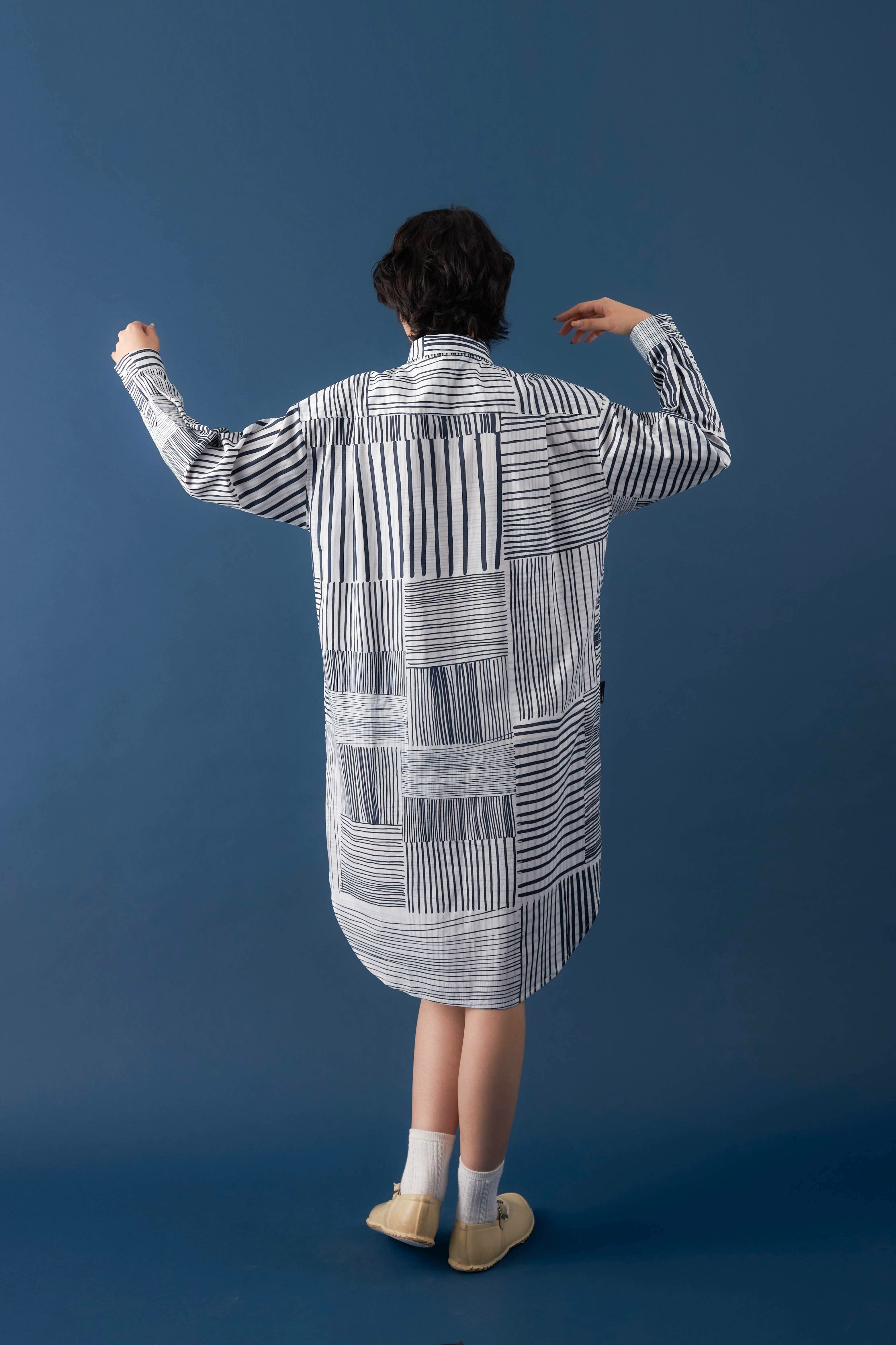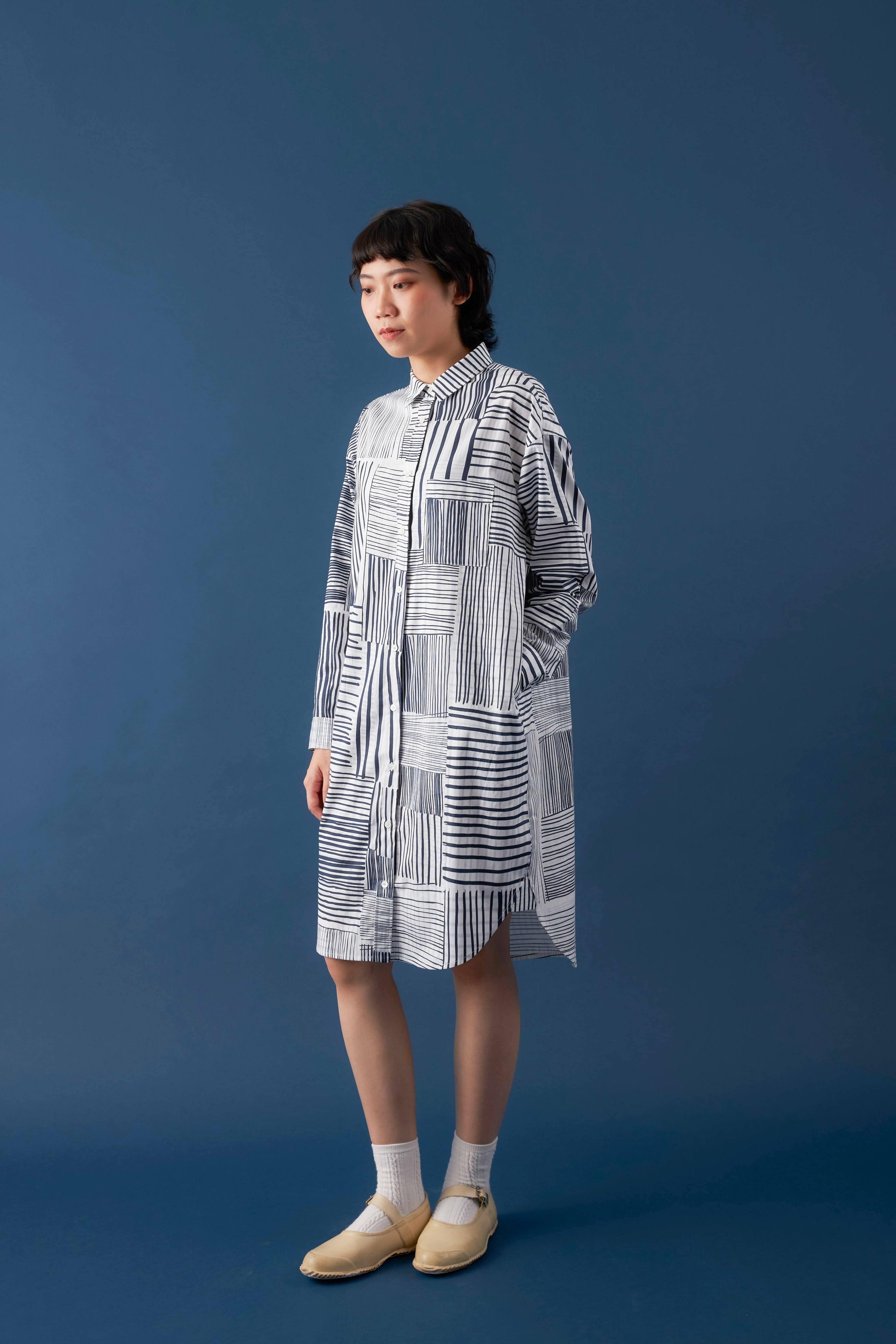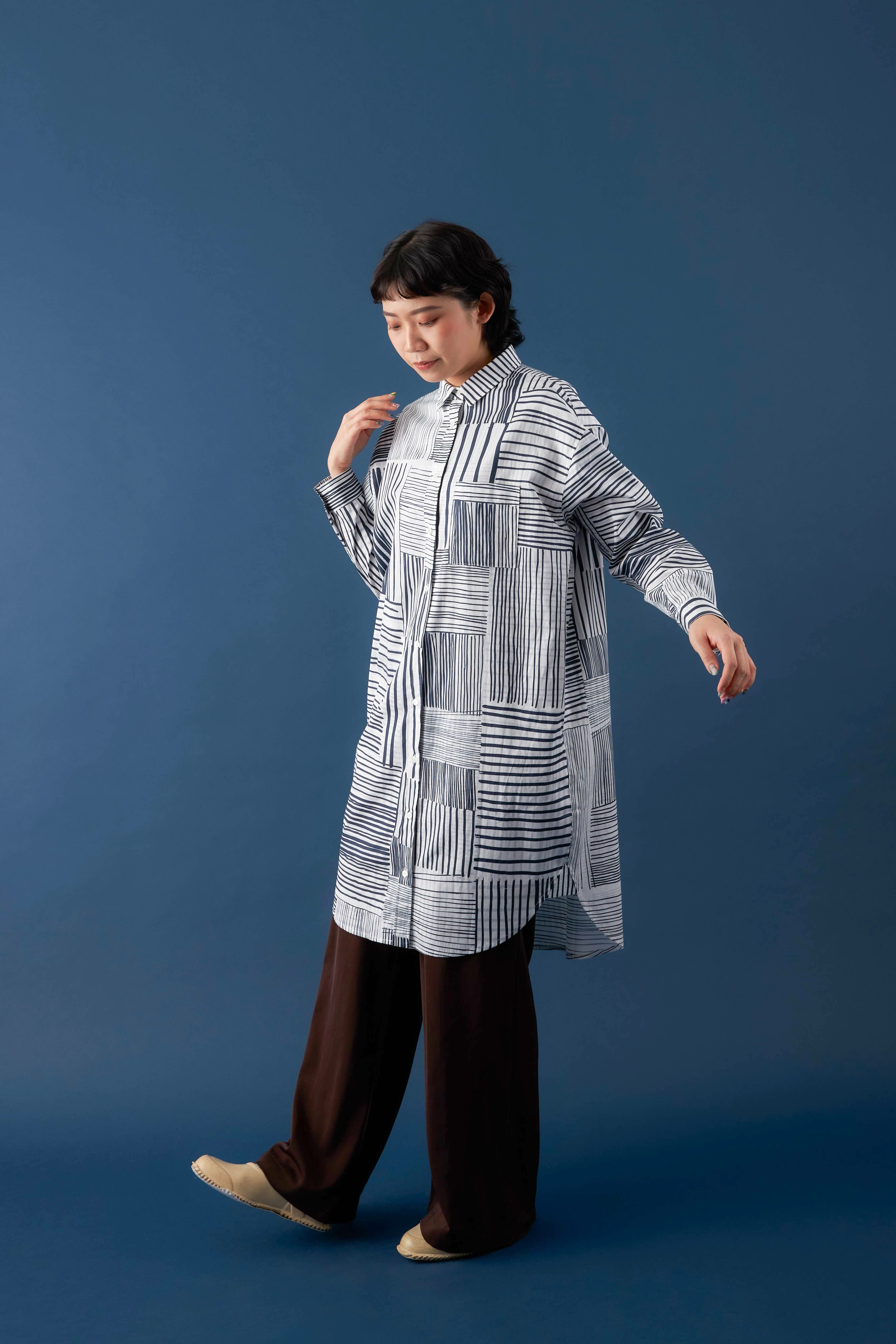 There's no better way to show off our signature patterns than by wearing them. This elongated shirt dress offers a subtle yet lively sheen for a sophisticated look. Features like the curved hem and side pockets add versatility, making it suitable as a top, a dress, or even an outer layer.