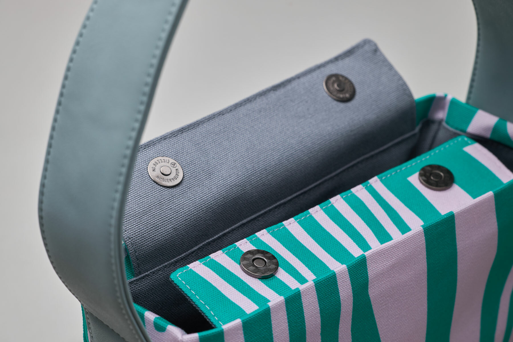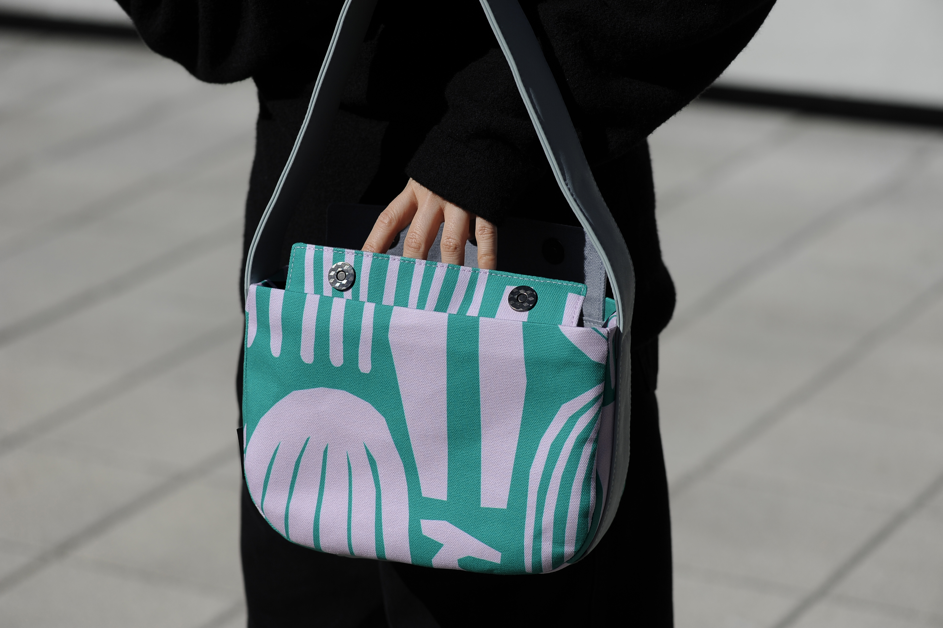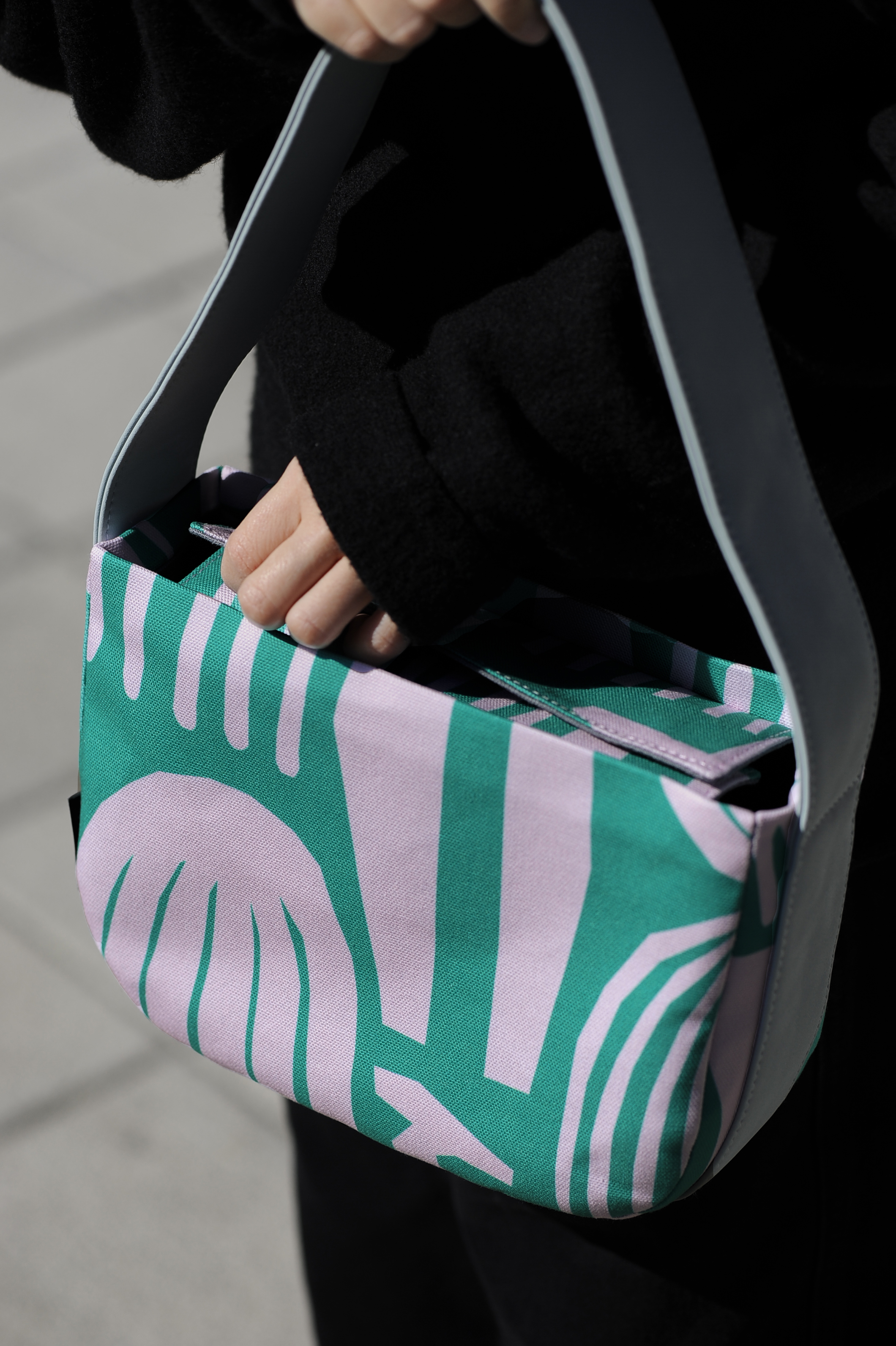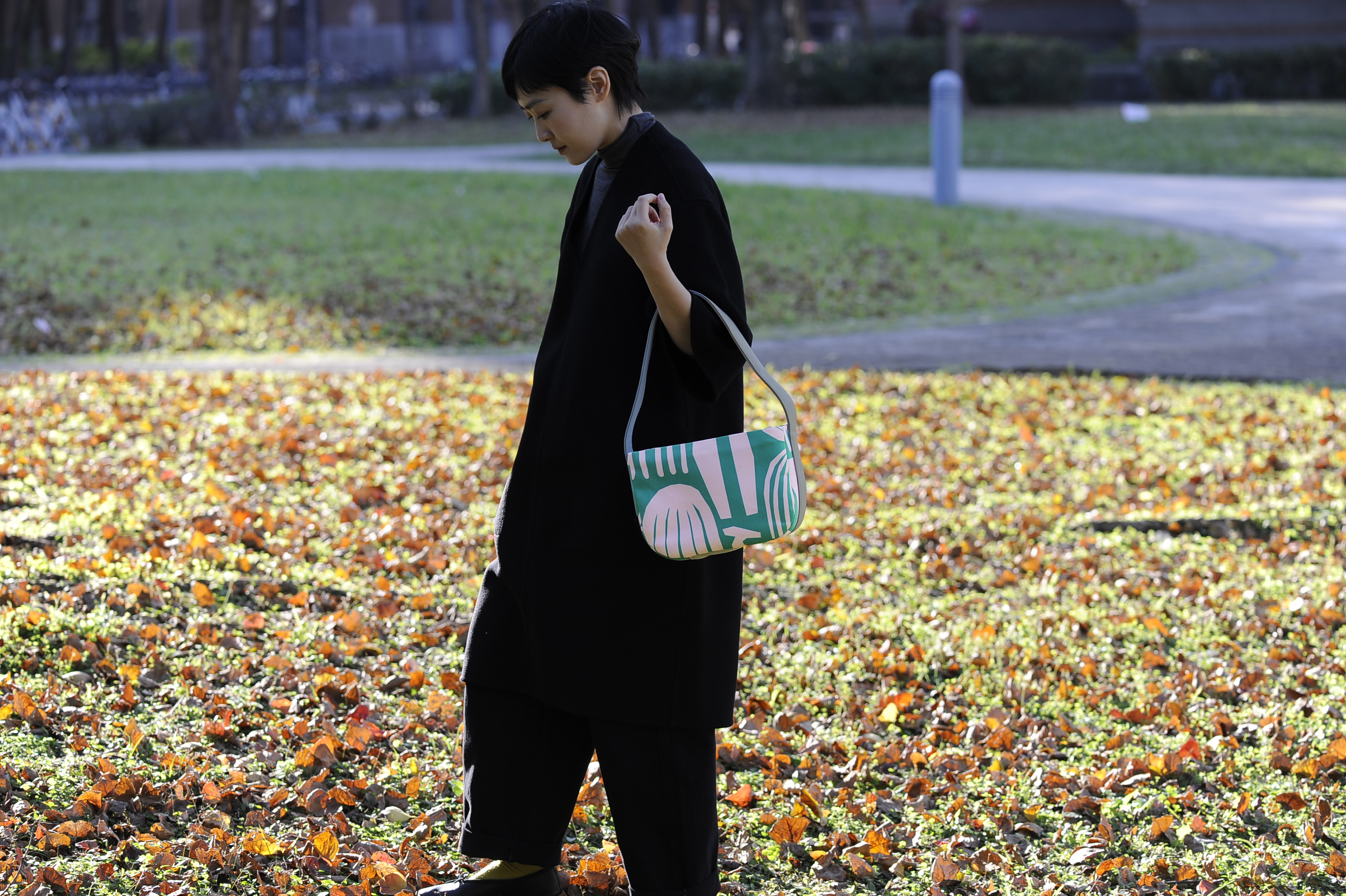The second time of recycled leather designs retains the minimalist magnetic closure, which automatically snaps shut after accessing the bag. Despite its compact design, it boasts a surprisingly large capacity, accommodating items like a folding umbrella (even a small thermos), wallet, headphones, small essentials, and more. The zippered inner pocket can easily fit an iPhone Pro Max and keys.