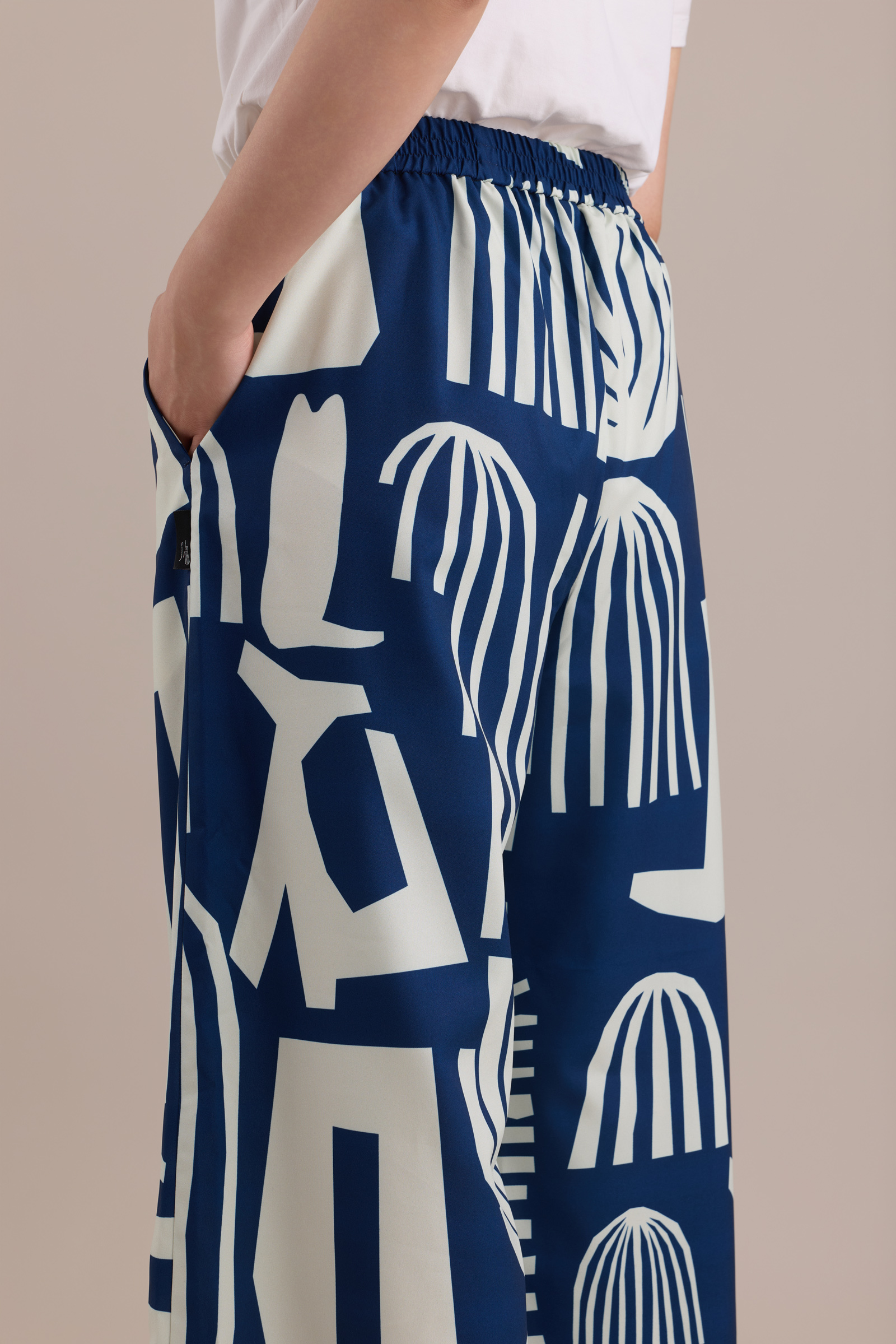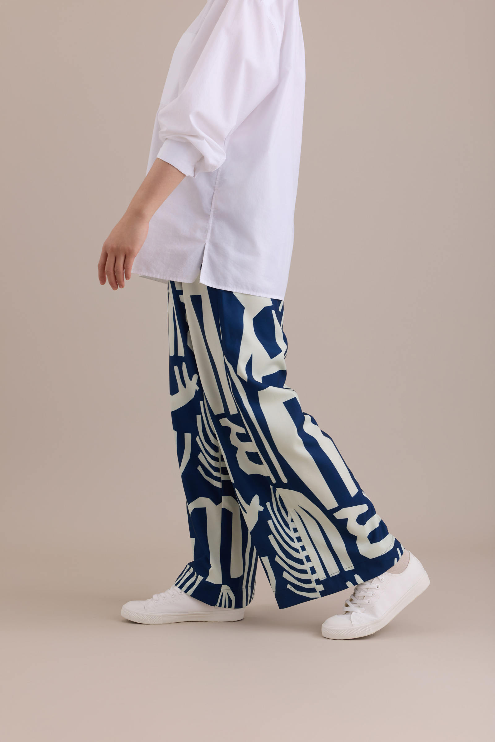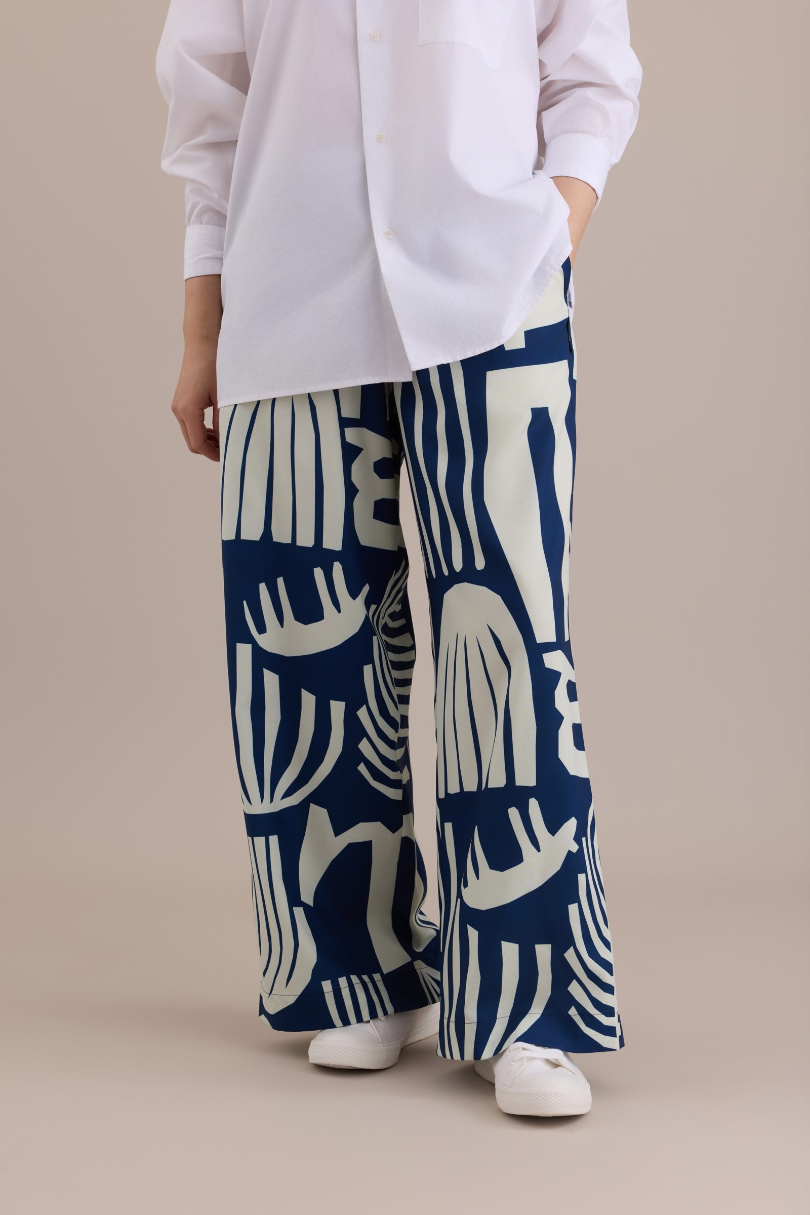 Crafted from a subtly glossy printed fabric, these pants transform into a pair of dynamic, effortlessly stylish wide-leg trousers.