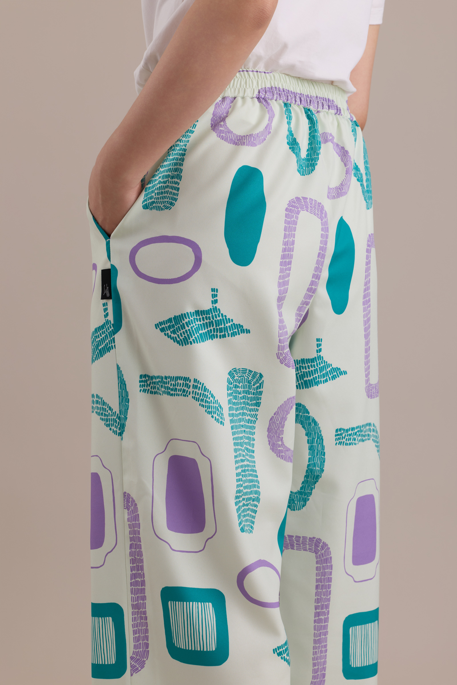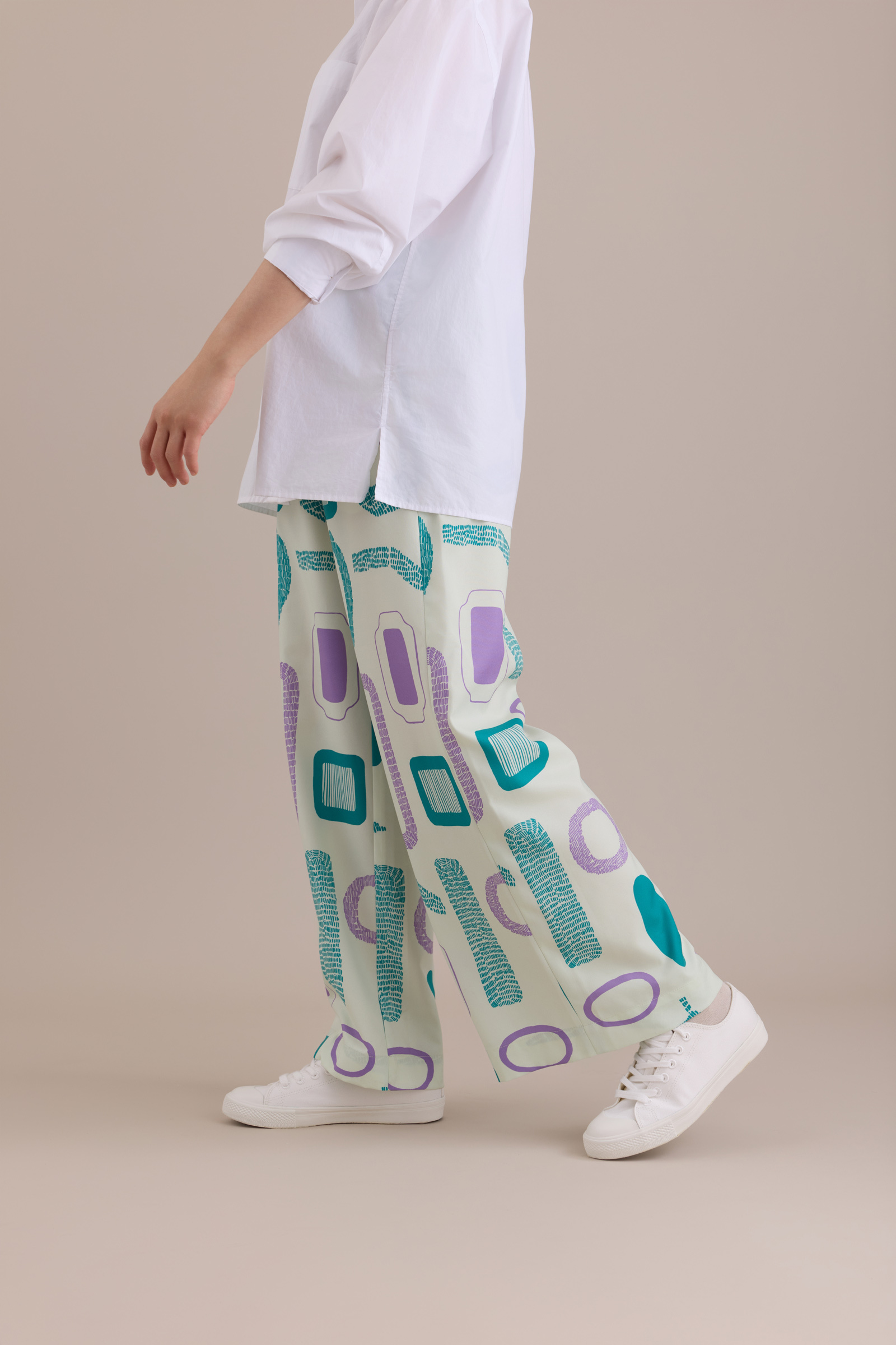 Crafted from a subtly glossy printed fabric, these pants transform into a pair of dynamic, effortlessly stylish wide-leg trousers.