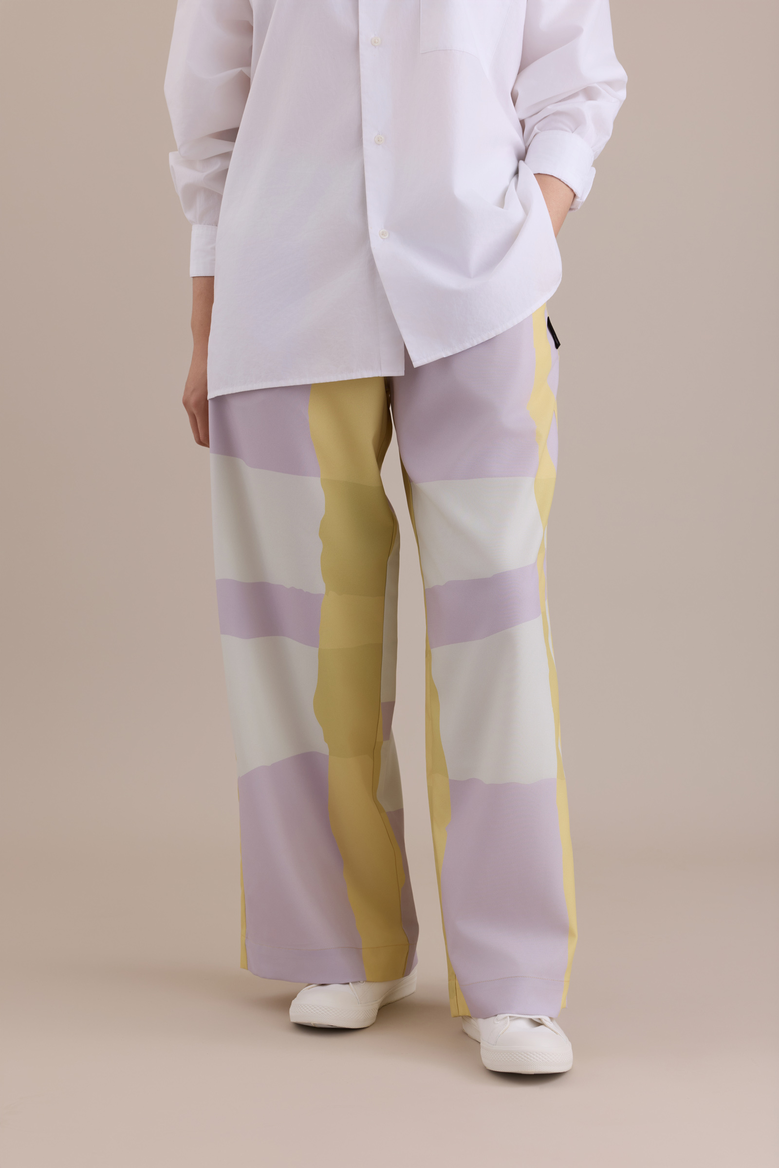 Crafted from a subtly glossy printed fabric, these pants transform into a pair of dynamic, effortlessly stylish wide-leg trousers.