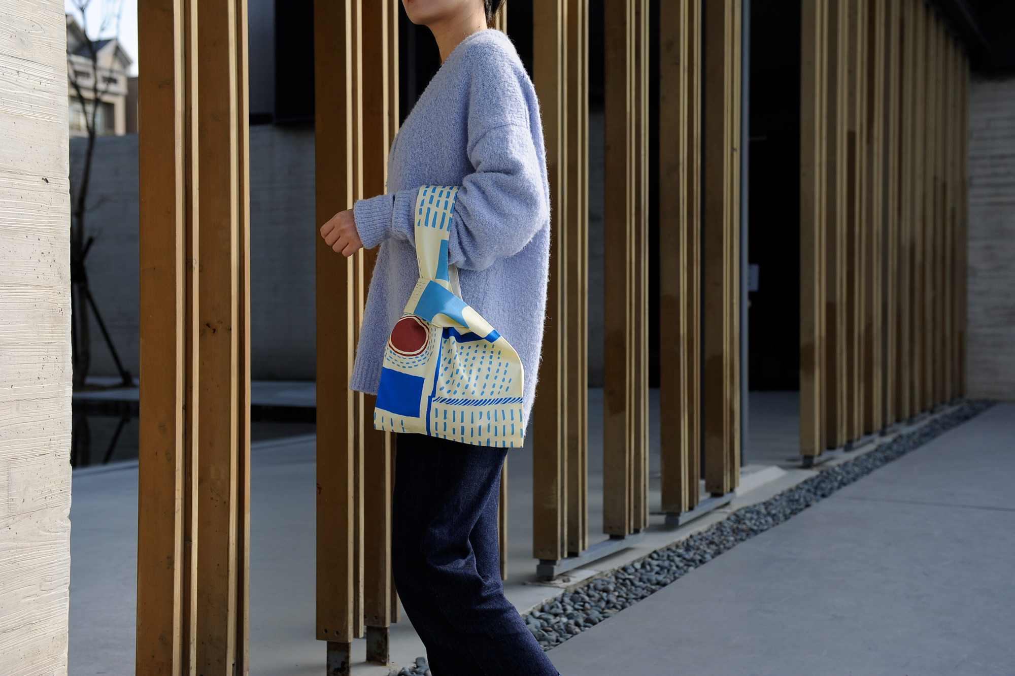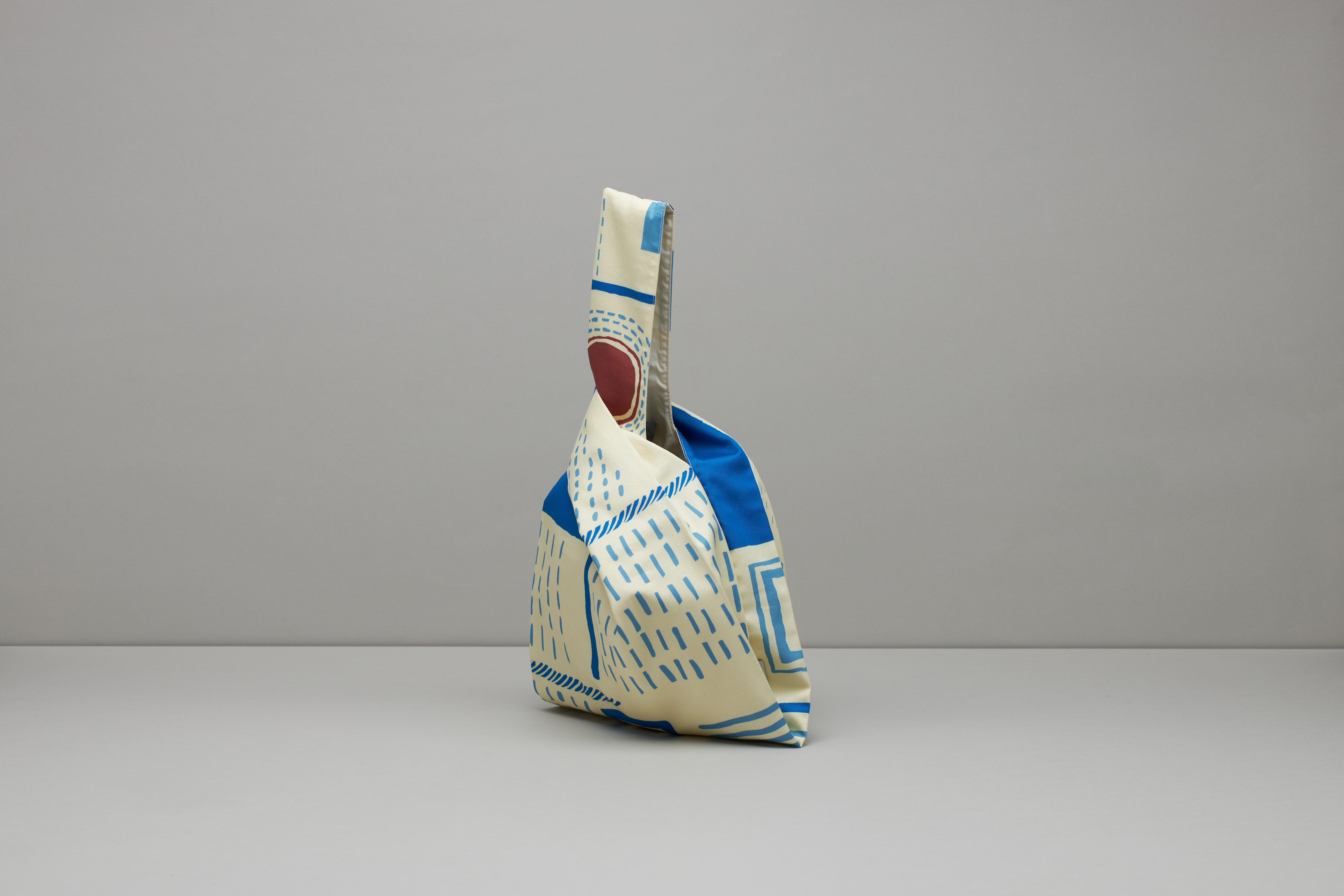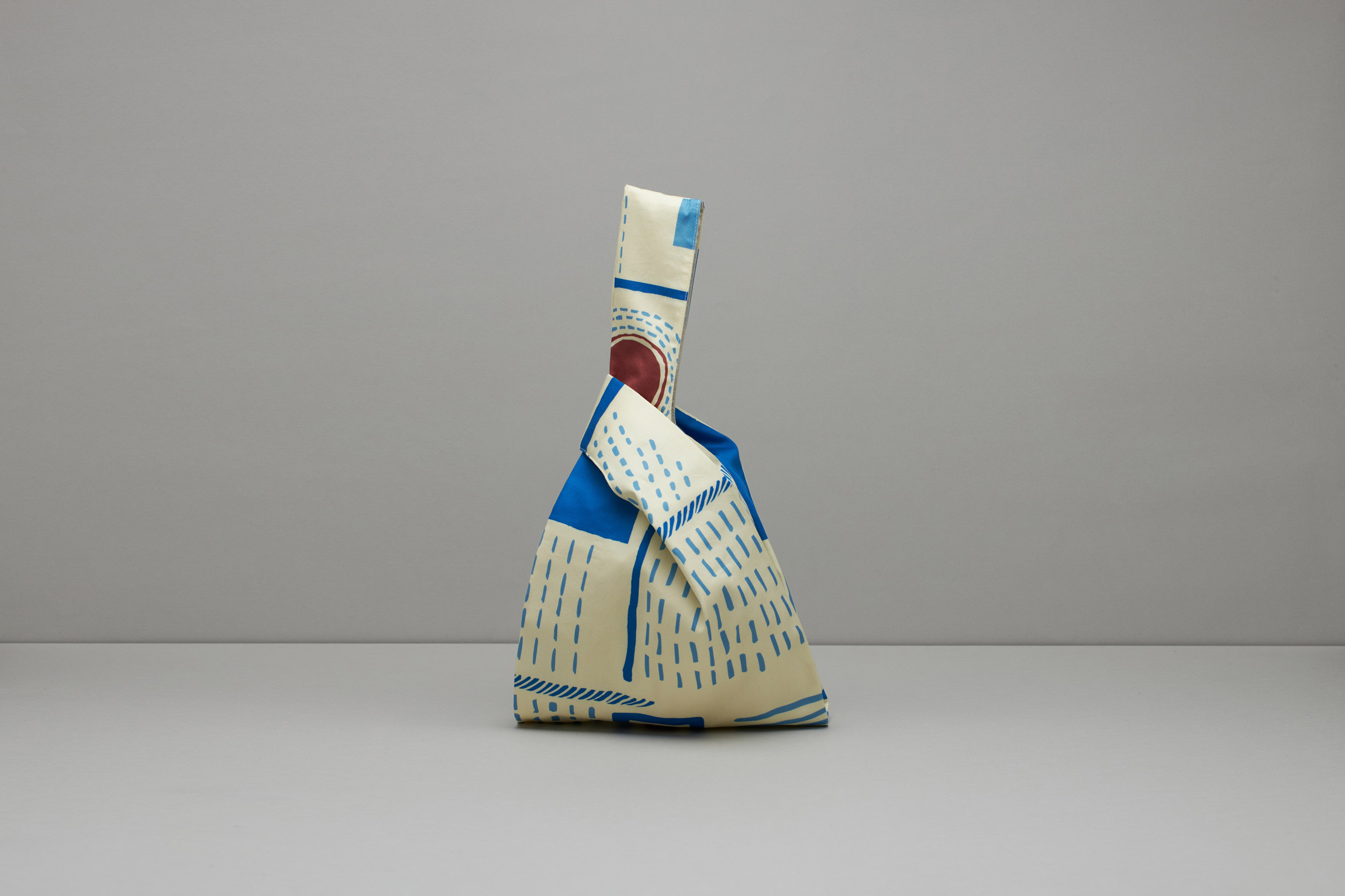 This Wrist Handbag, or Japanese Knot Bag, is inspired by the red-white stripe plastic bags seen quite commonly in everyday life here in Taiwan. The asymmetrical handle length adds an extra design element to the overall look.
