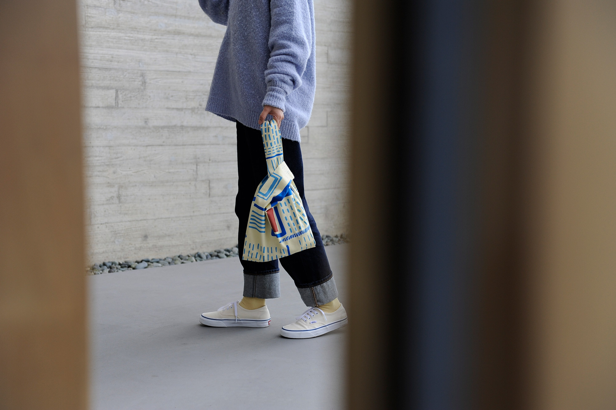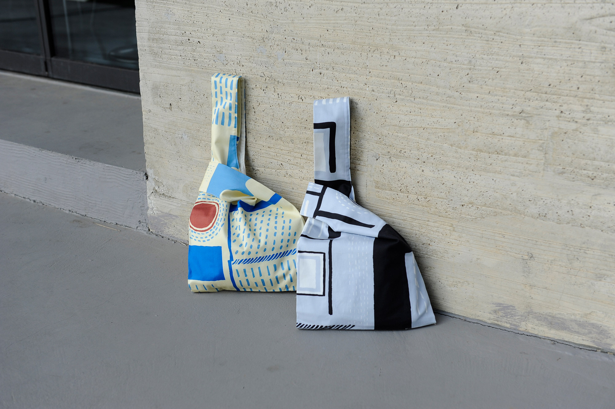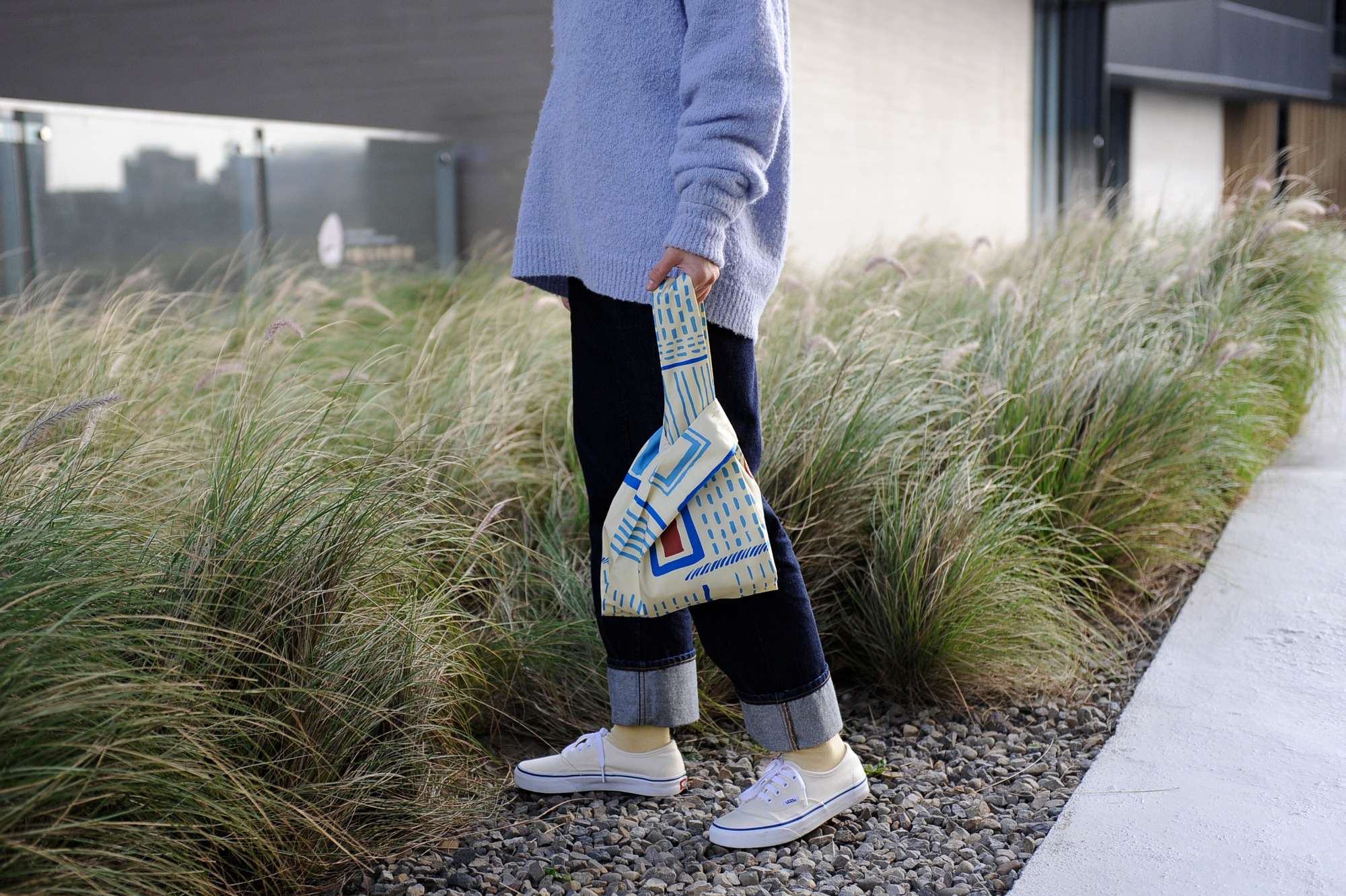 This Wrist Handbag, or Japanese Knot Bag, is inspired by the red-white stripe plastic bags seen quite commonly in everyday life here in Taiwan. The asymmetrical handle length adds an extra design element to the overall look.