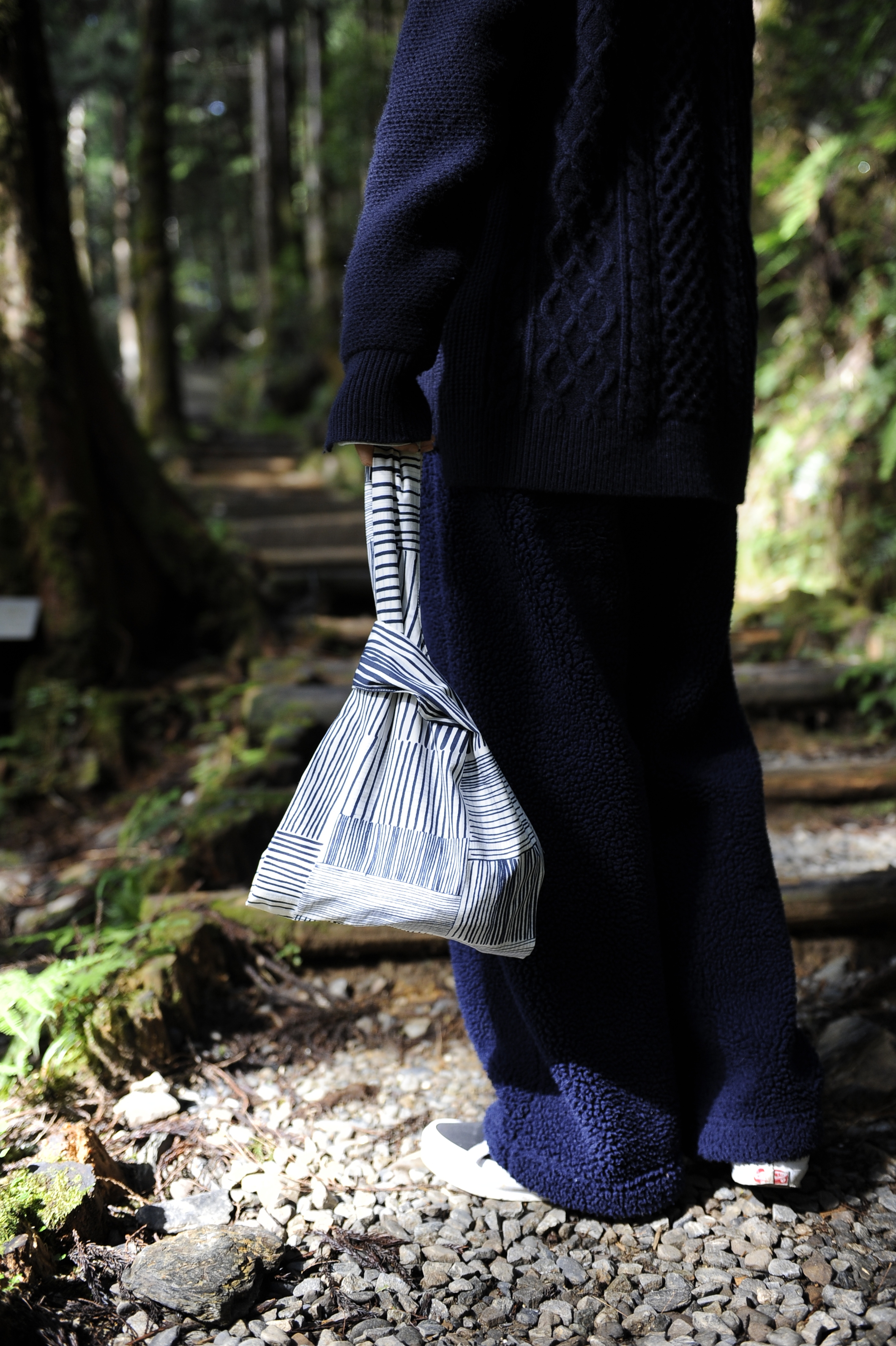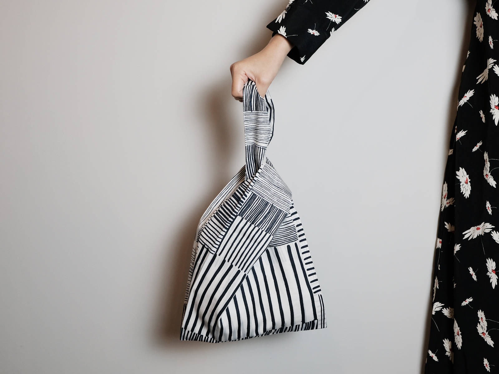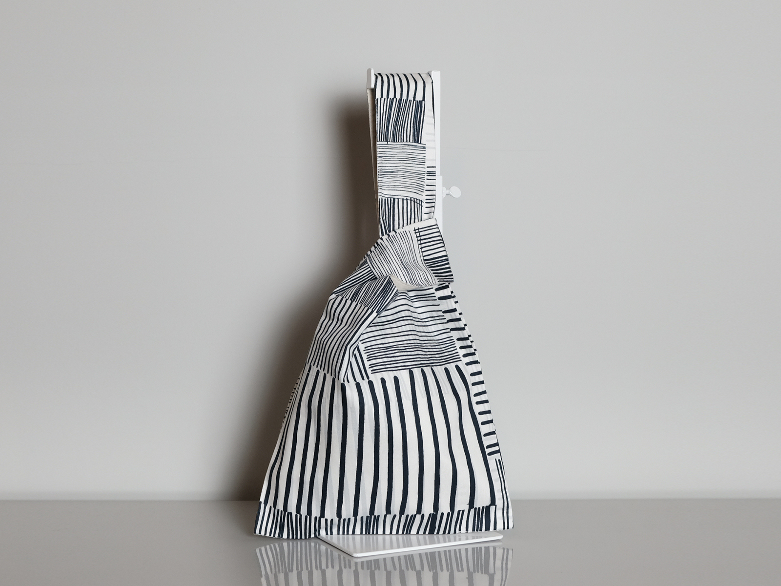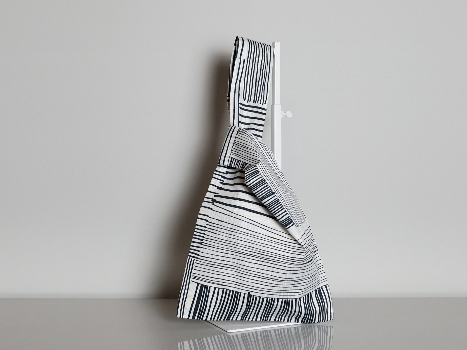 This Wrist Handbag, or Japanese Knot Bag, is inspired by the red-white stripe plastic bags seen quite commonly in everyday life here in Taiwan. The asymmetrical handle length adds an extra design element to the overall look.
