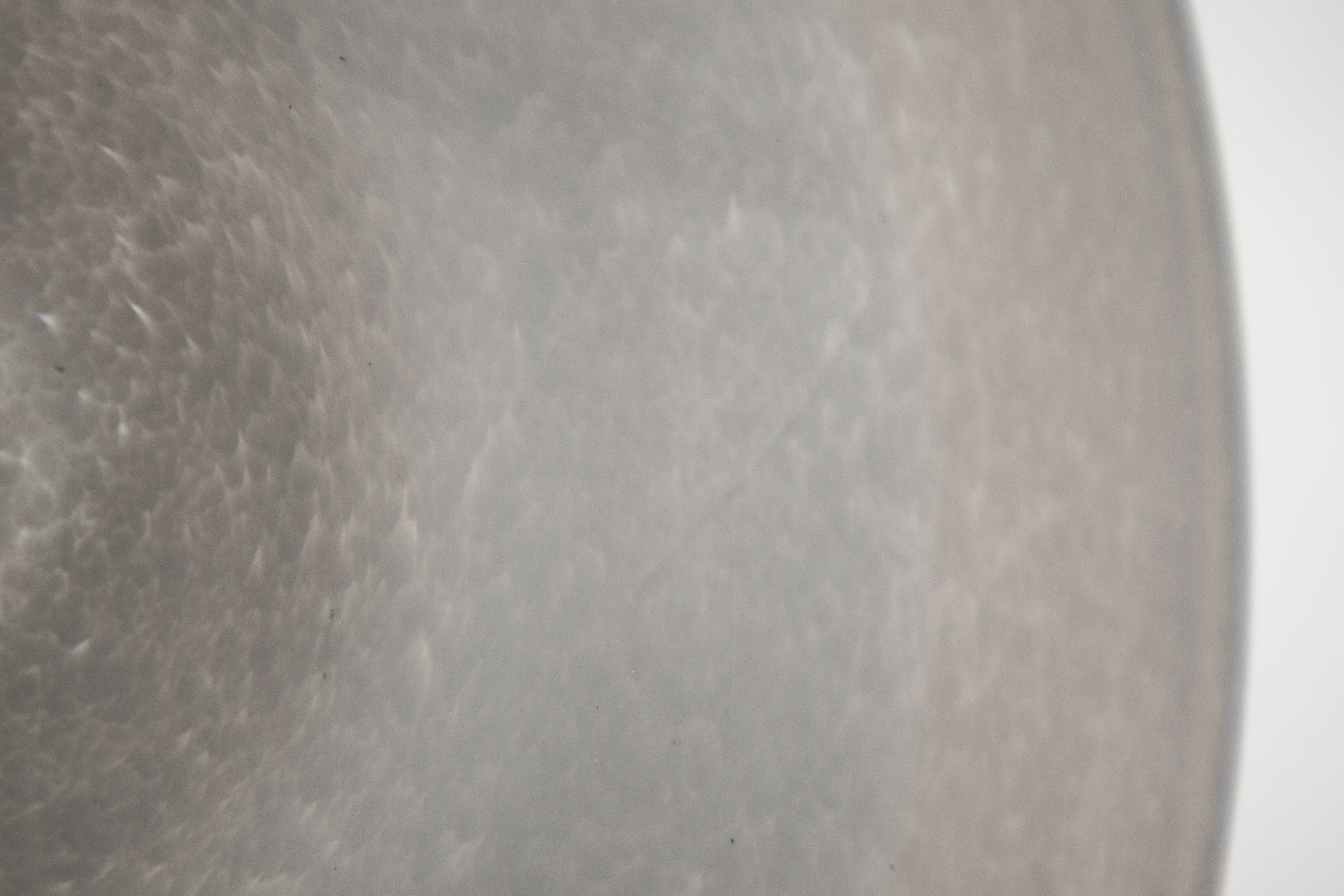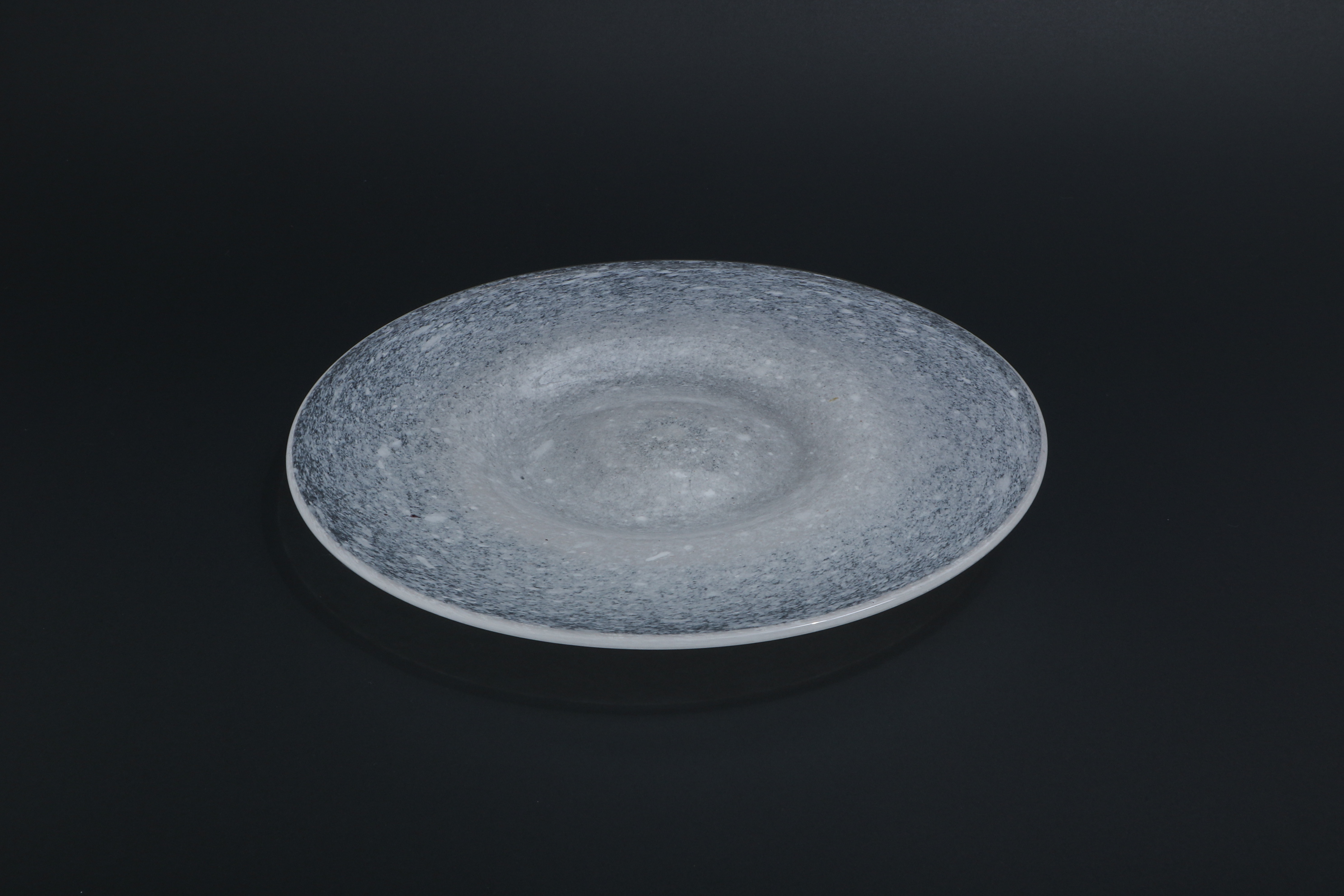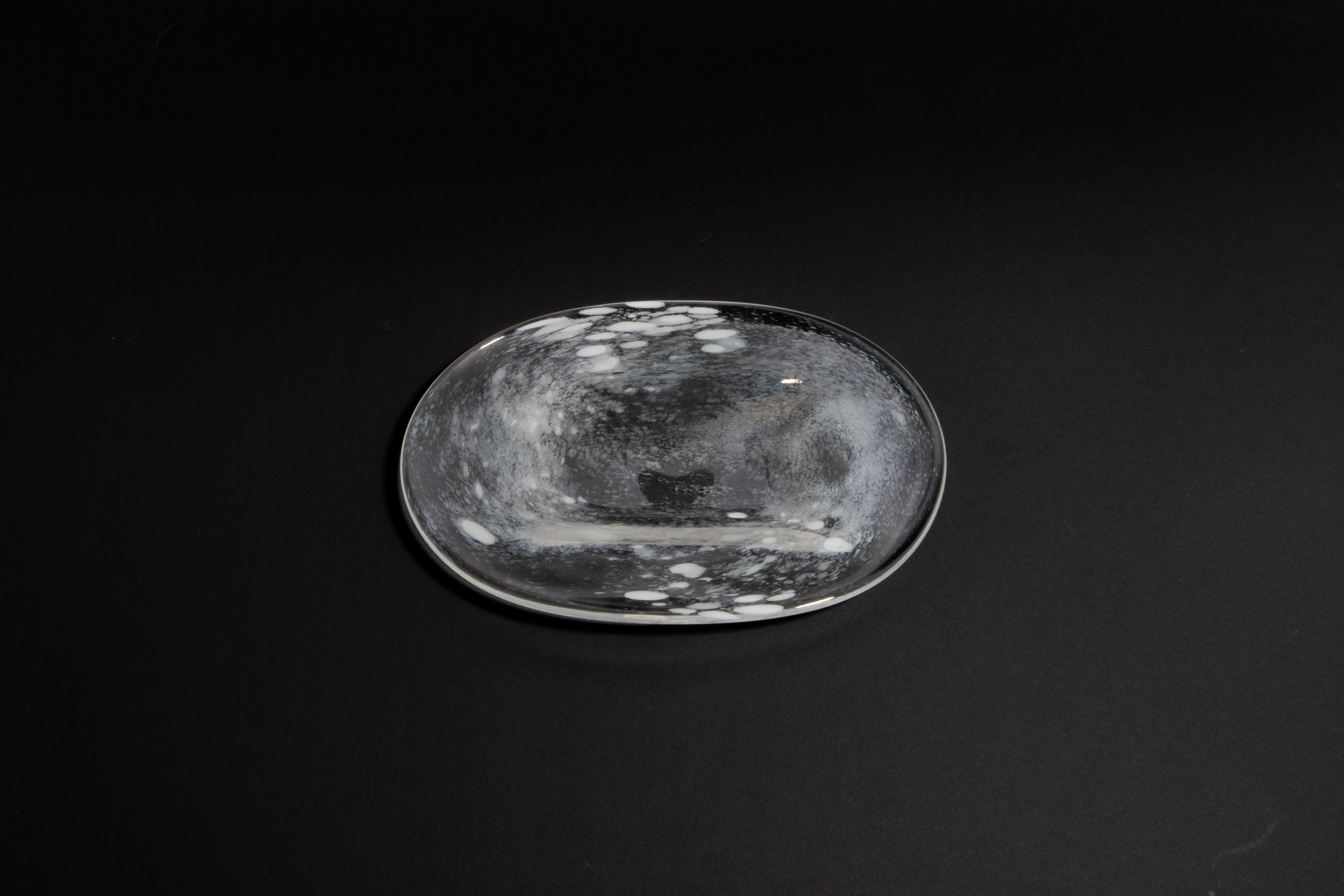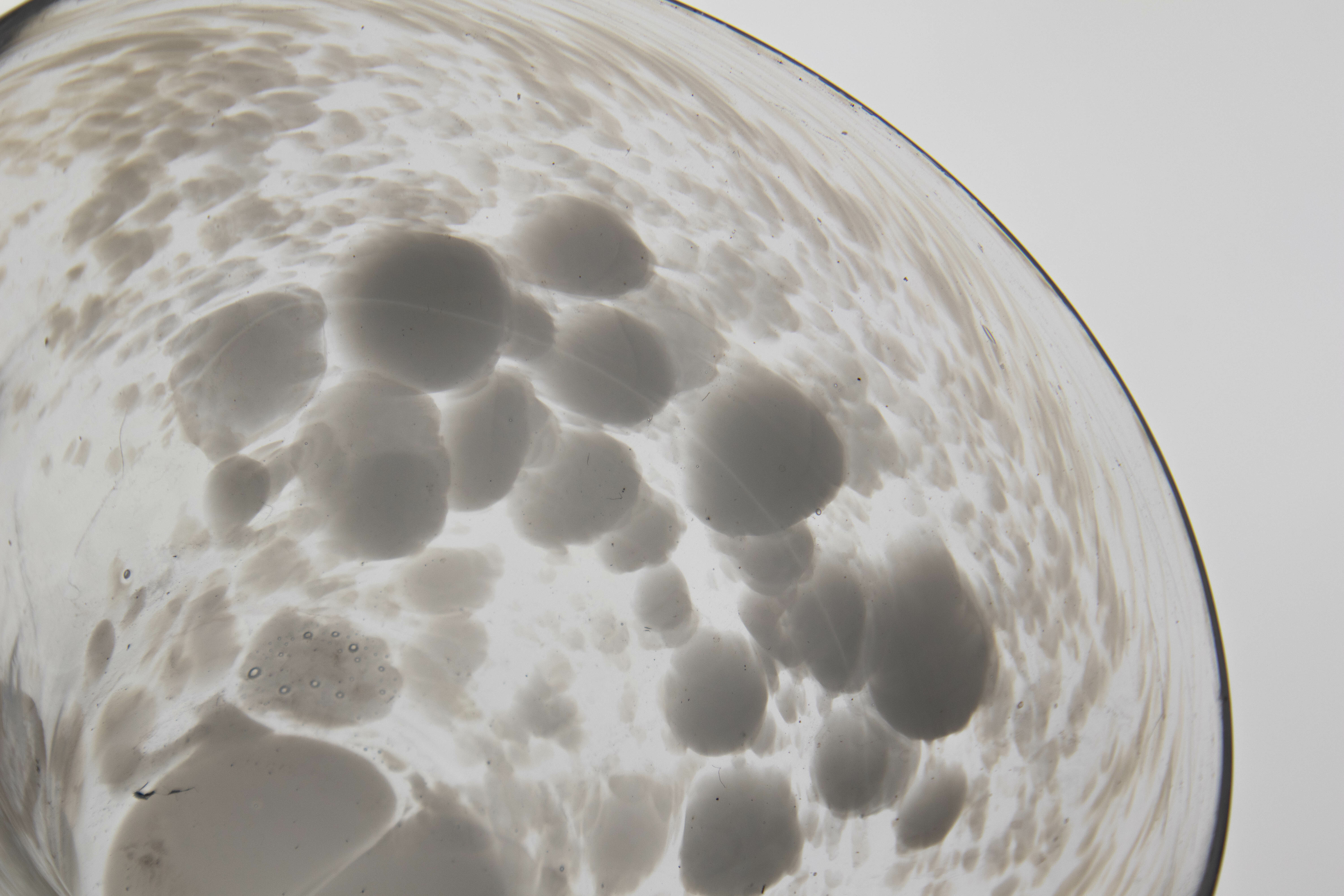 玻璃的厚薄分佈,影響白色的濃淡,這種白,並非白紙的白,而是隨著厚薄變化、過火與否呈現出時而半透明、時而疏密呼吸錯落、時而偏黃偏藍的白,屬於玻璃獨特的白。手的介入讓材料多了許多變數,不完全、不均齊的呈色,如鏡子般光滑卻有著綿密如膚起伏的白色質地,強光下透出乳白的色澤,從孔洞的分布上可以看出玻璃高流動成形的過程,對比工業化一致的白,展現了屬於手工溫柔的情感。