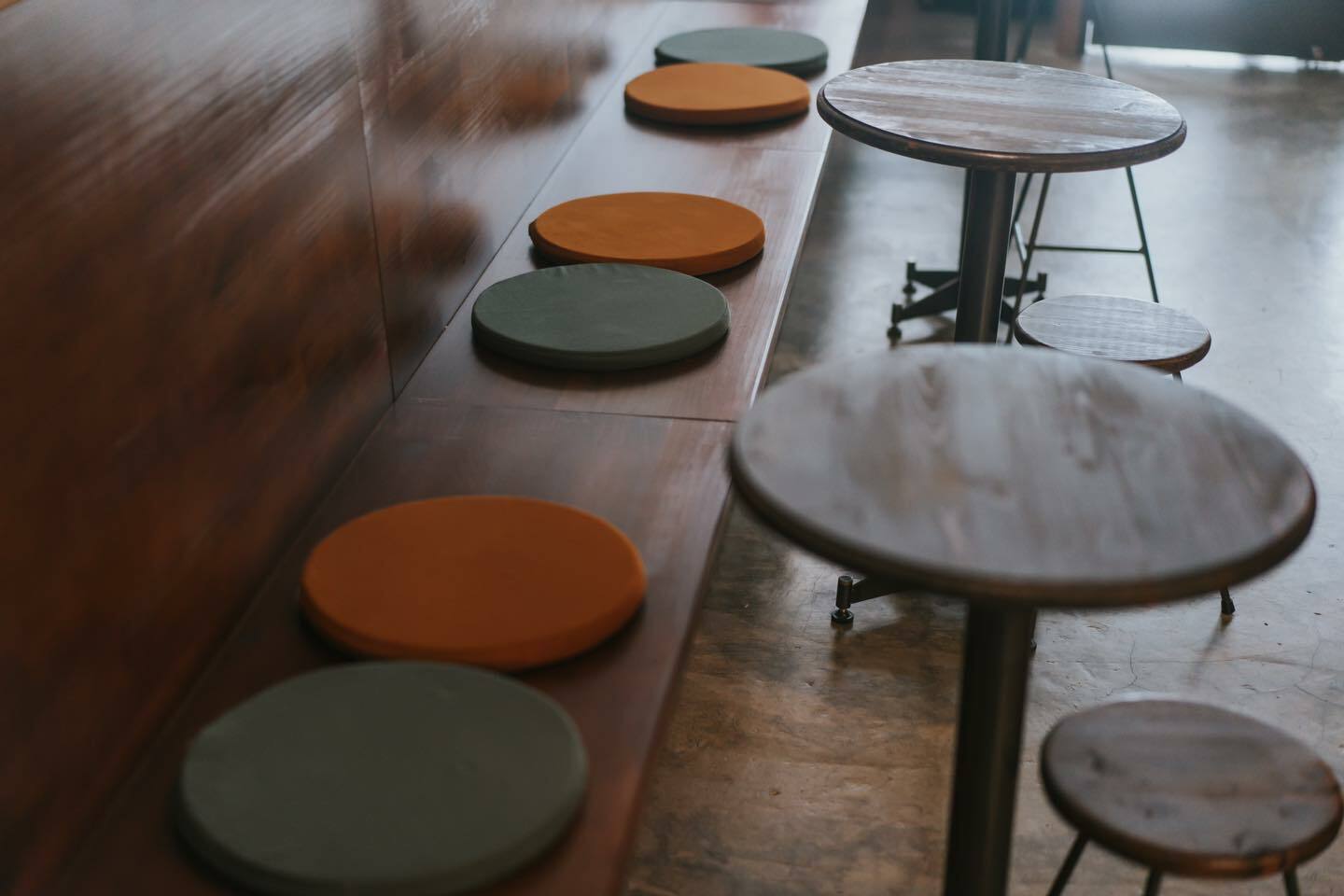 當初序中委託我們製作椅墊,希望能以店裡沈穩的色系來發想,並說明店裡會賣深焙咖啡,想傳達一種濃厚懷舊的氣氛,我認這樣的話,以環境的色彩來延伸是最好的,因此選用偏藍的綠色,以及棕色來做為搭配,而椅墊的另一面其實還有一個奶茶色,我個人覺得或許也跟店裡木質的色調很協調,也許有一天能夠被客人發現,重見天日。