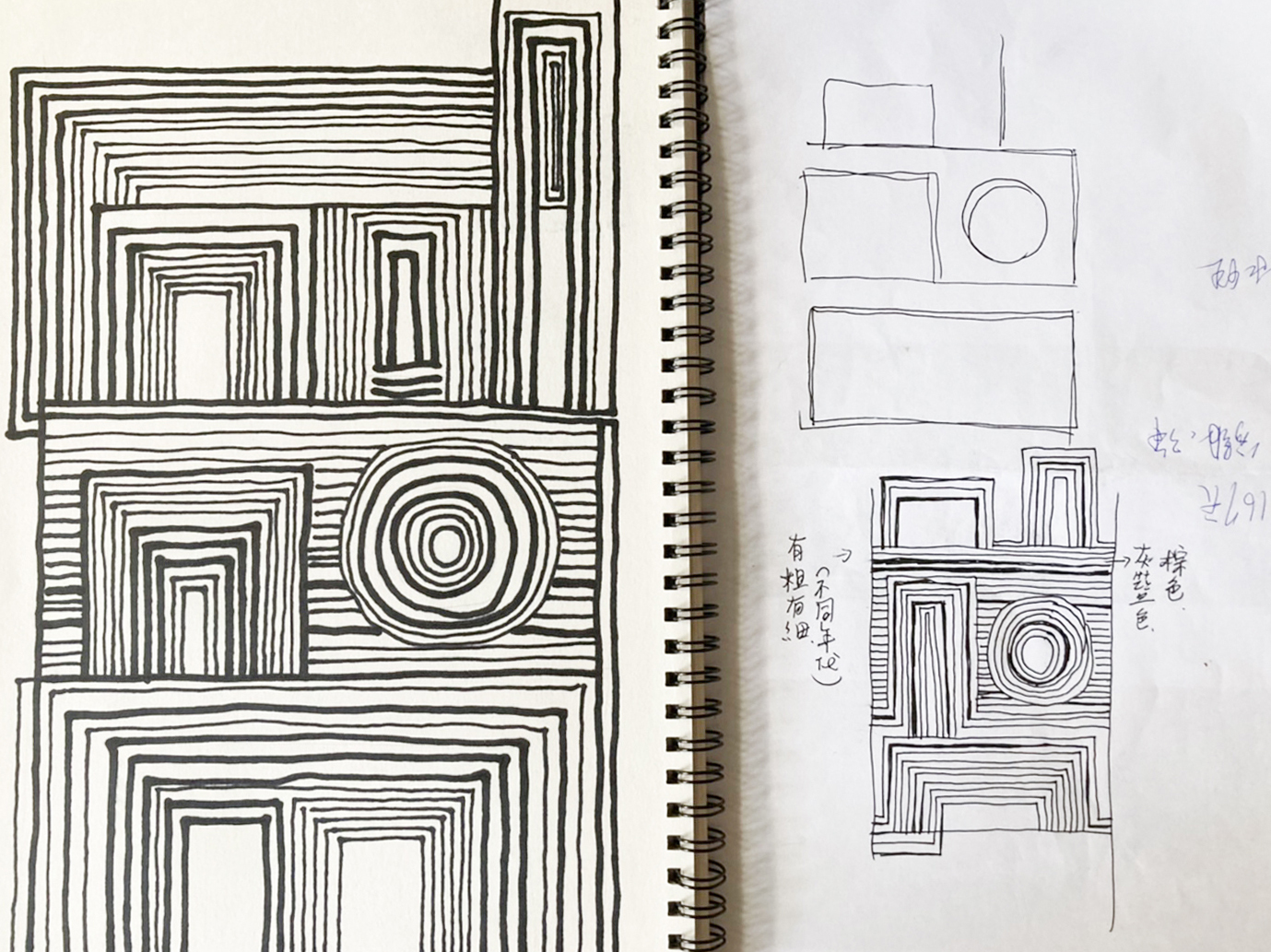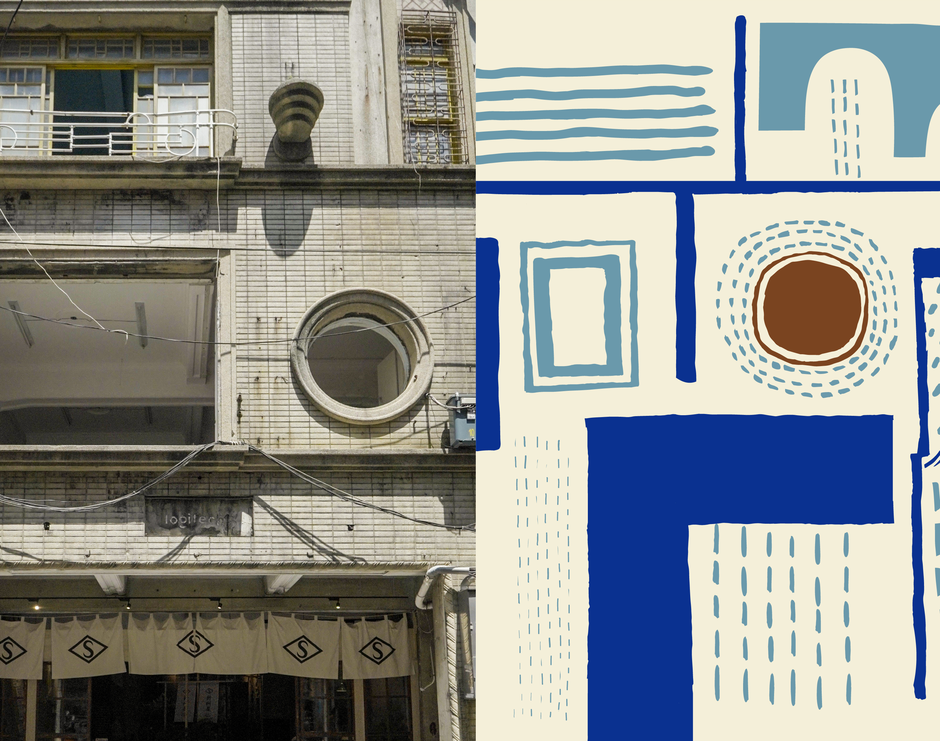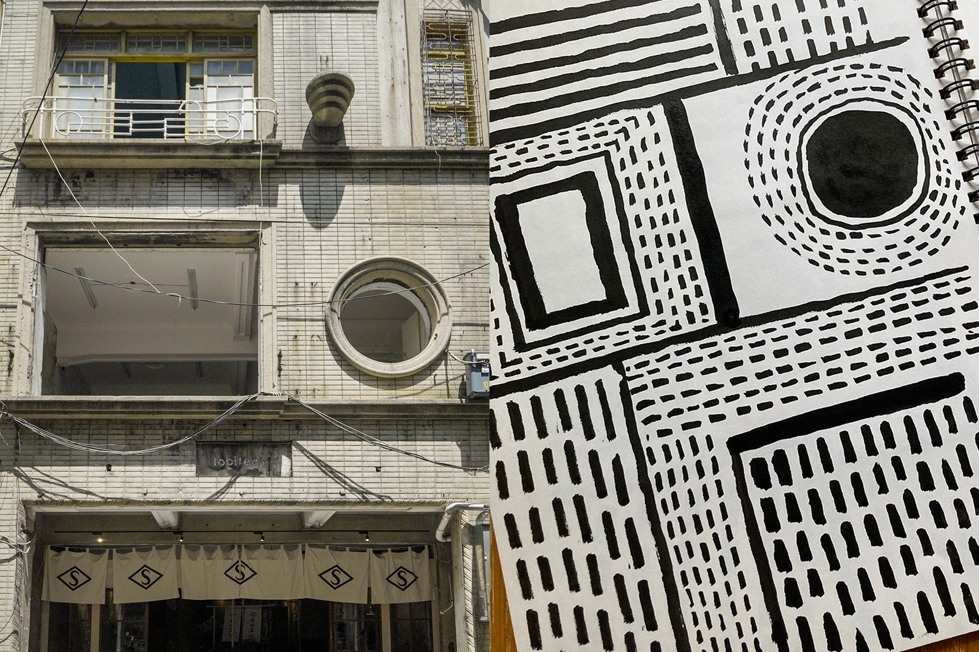 新州屋落成於昭和九年(民國23年),年齡已屆滿90年,這個空間的符號太過豐富,除了原本空間的框架之外,數度易主的痕跡也在空間中屢見不鮮。所以在設計圖案的過程中,曾經因為太過貪心而想將所有看見的要素全部塞進圖形裡,導致混亂無章,最後我嘗試將空間裡幾個顯眼且特殊的元素拆解,整理出圓形、方形、虛線、隔間等不同造型加以簡化排列,並將這些元素融合自身的經歷來繪製出來。