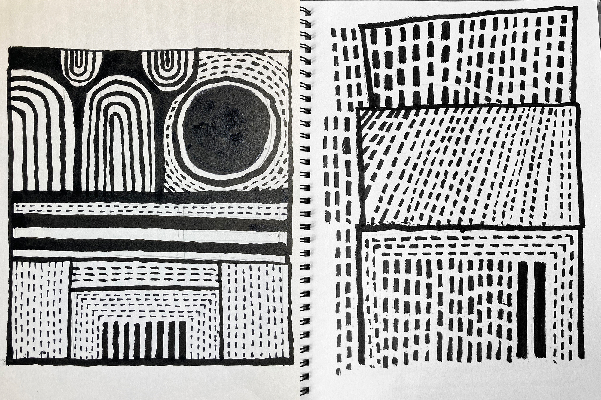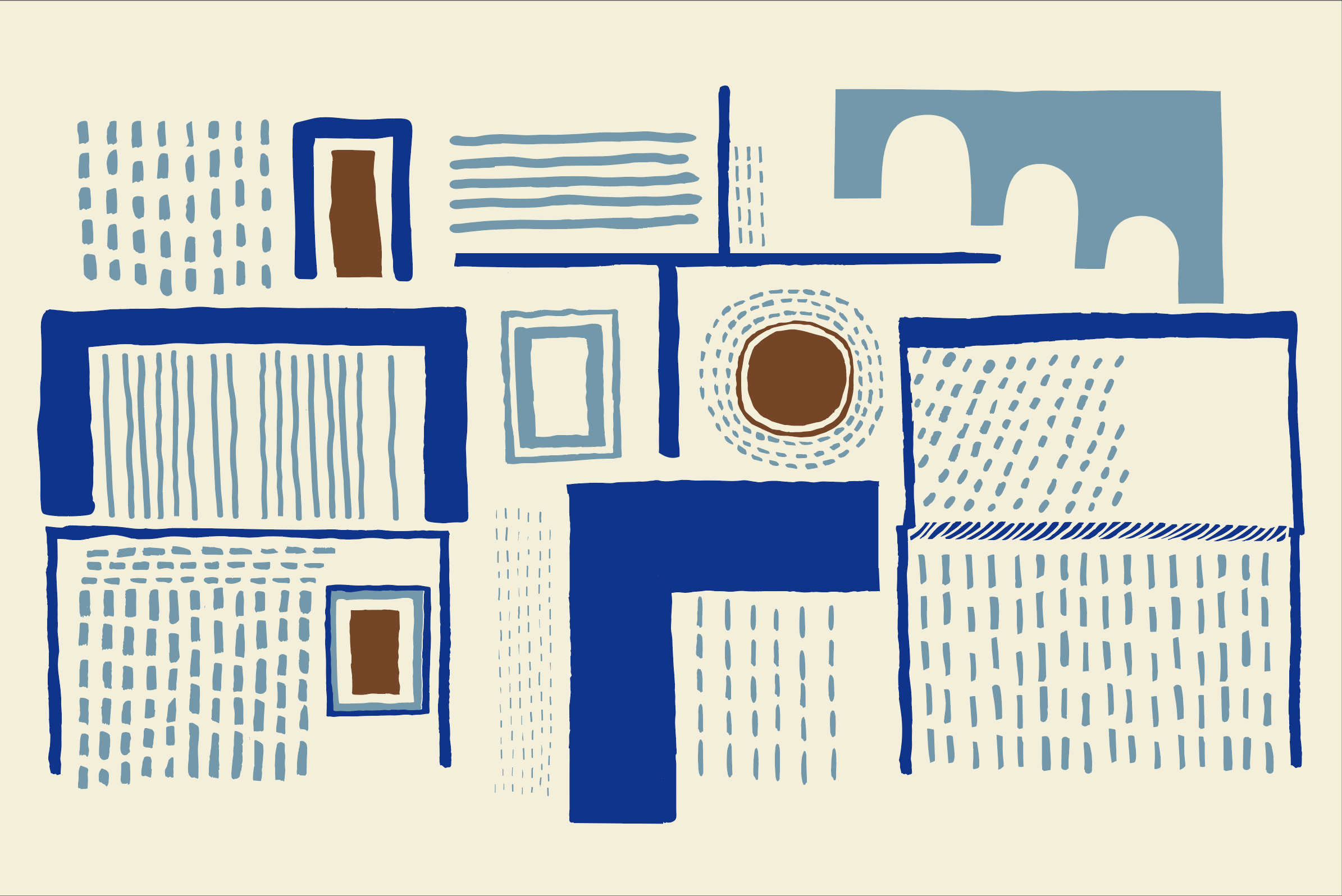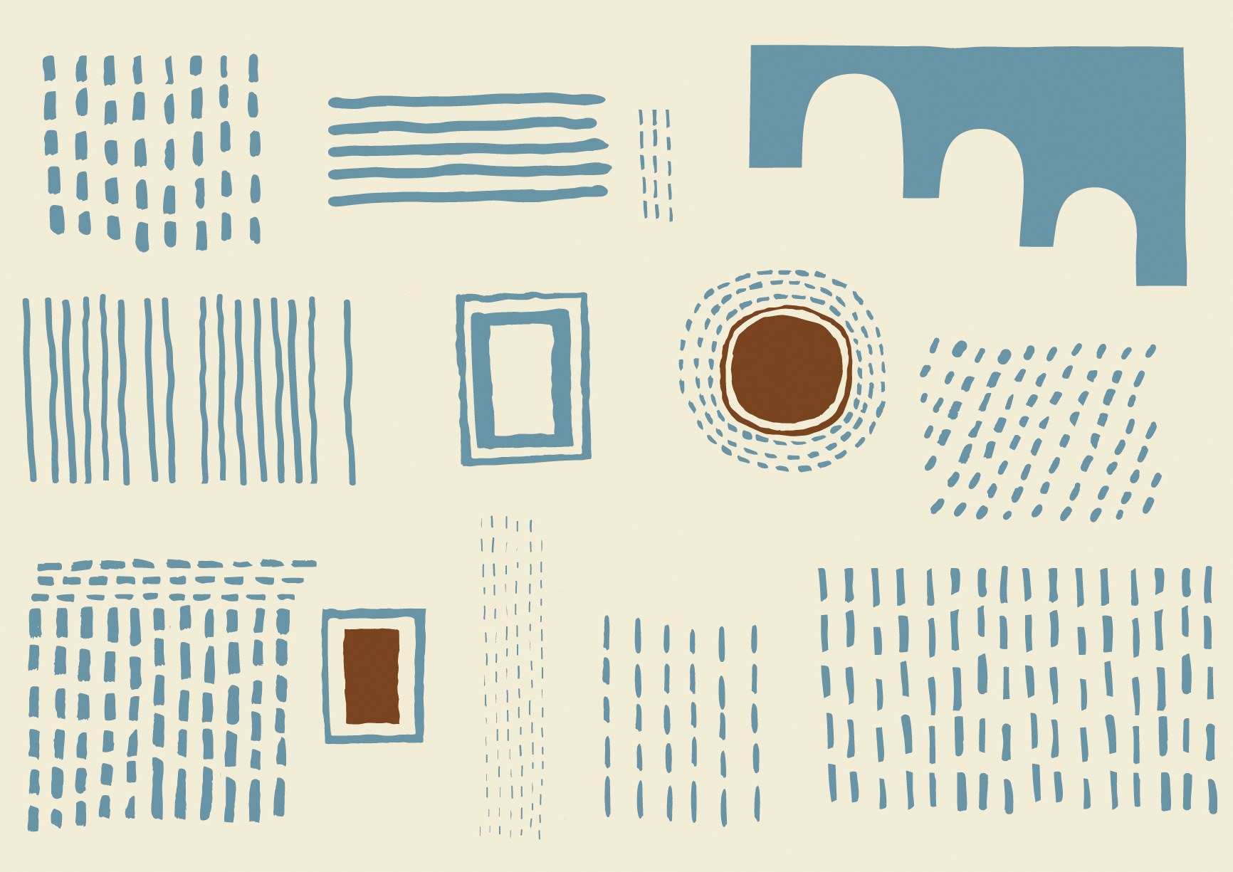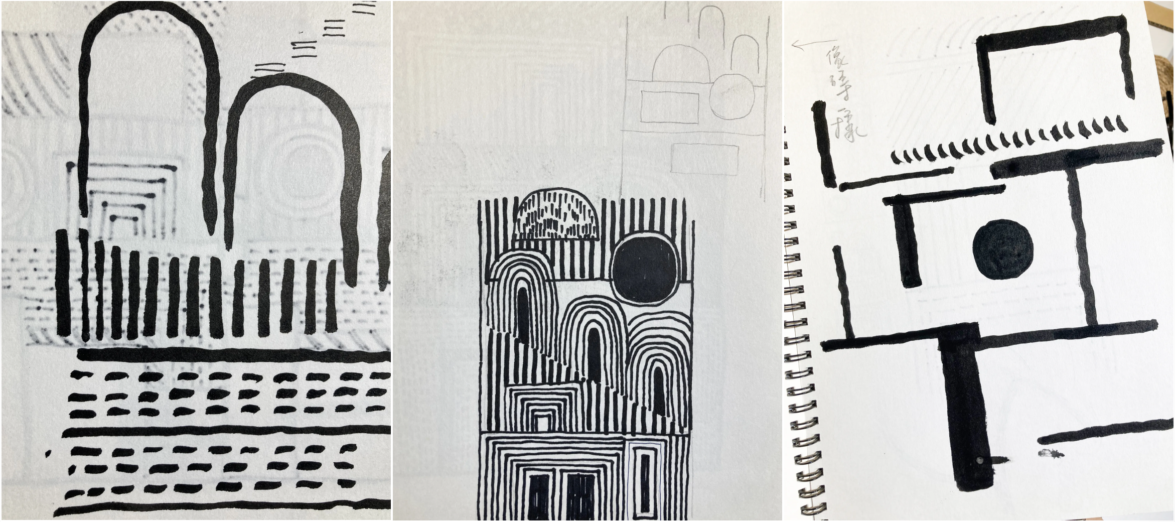 新州屋落成於昭和九年(民國23年),年齡已屆滿90年,這個空間的符號太過豐富,除了原本空間的框架之外,數度易主的痕跡也在空間中屢見不鮮。所以在設計圖案的過程中,曾經因為太過貪心而想將所有看見的要素全部塞進圖形裡,導致混亂無章,最後我嘗試將空間裡幾個顯眼且特殊的元素拆解,整理出圓形、方形、虛線、隔間等不同造型加以簡化排列,並將這些元素融合自身的經歷來繪製出來。