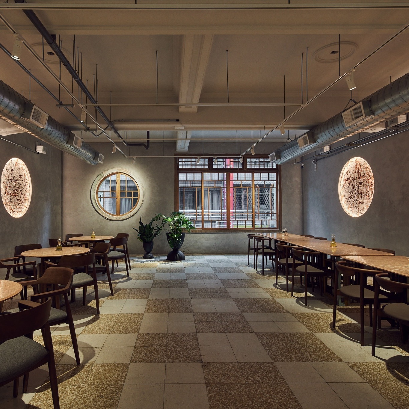 新州屋的樑將天花板切割成多個條狀塊面,而梁上也有早期的線版飾條,非常精緻,在我設計的這款相逢圖形裡,所有的元素都充滿不同的個性,也在隔間裡安身立命,也包容了各行各業的人在此發芽。