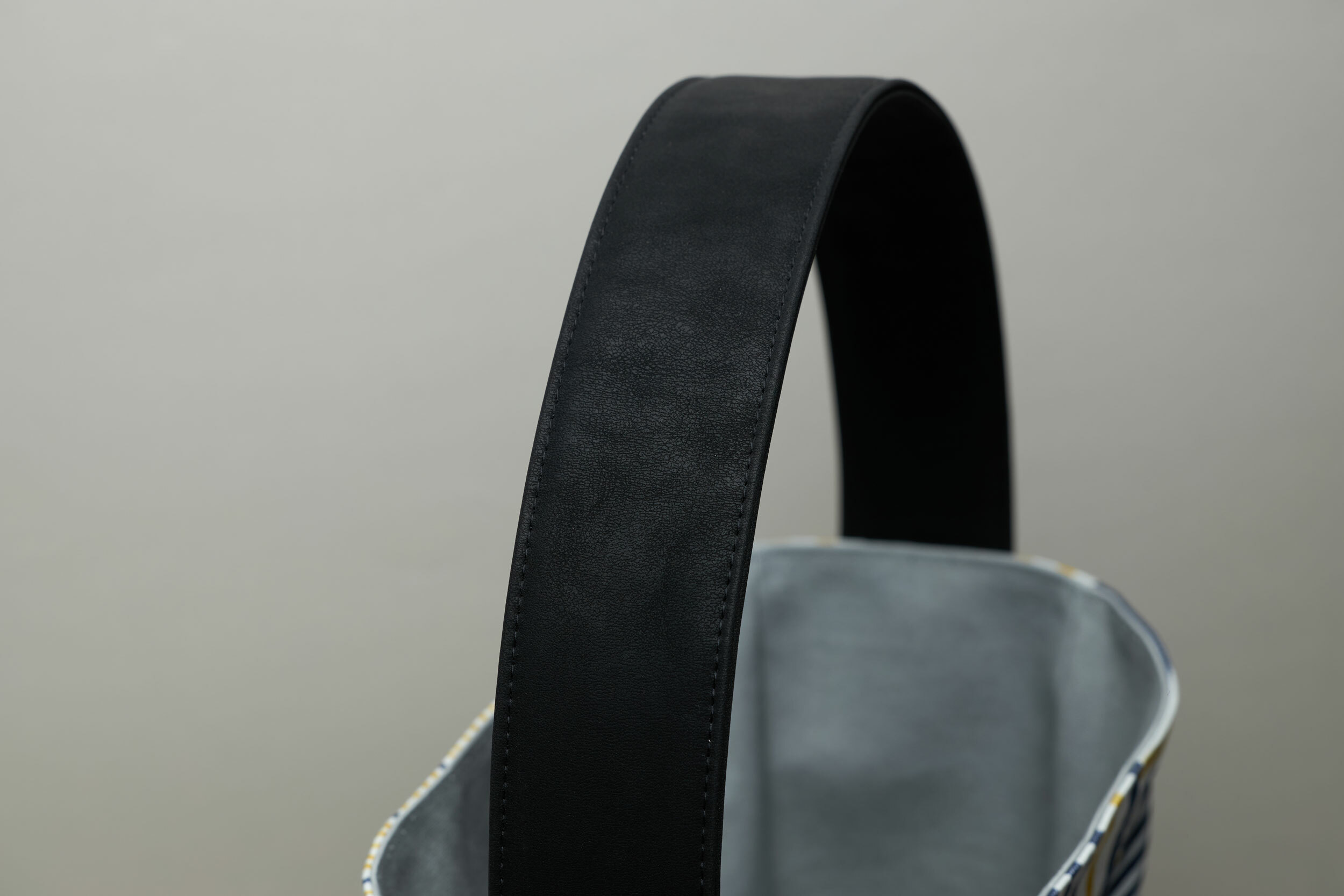 顏色 / 帆布:芥末黃、藍、白。肩背皮革:黑色霧面